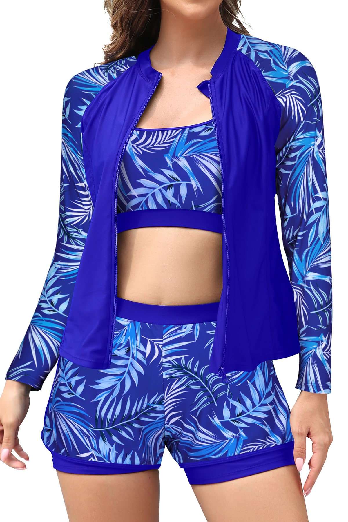 Dieses 3-teilige Tankini Set ist perfekt für alle Wassersport-Fans! Enthält ein langärmeliges Rash Guard Oberteil mit Reißverschluss, einen sportlichen BH und hoch taillierte Badeshorts. Aus atmungsaktivem, schnell trocknendem Material mit super Dehnbarkeit.\\n\\nDas Oberteil schützt vor Sonne und kaltem Wasser, der BH gibt natürlichen Halt und die Shorts bieten Bauchkontrolle. Perfekt für Schwimmen, Surfen, Tauchen, Stand-Up-Paddling oder einfach nur für den Strand.\\n\\nEinfach an- und auszuziehen dank Front-Reißverschluss. Die hoch taillierte Shorts bedeckt angenehm viel und gibt dir Sicherheit beim Bewegen. Sieht sportlich aus und ist trotzdem feminin. Für alle, die beim Wassersport nicht auf Style verzichten wollen. Bitte vorher Größentabelle checken für die perfekte Passform!
