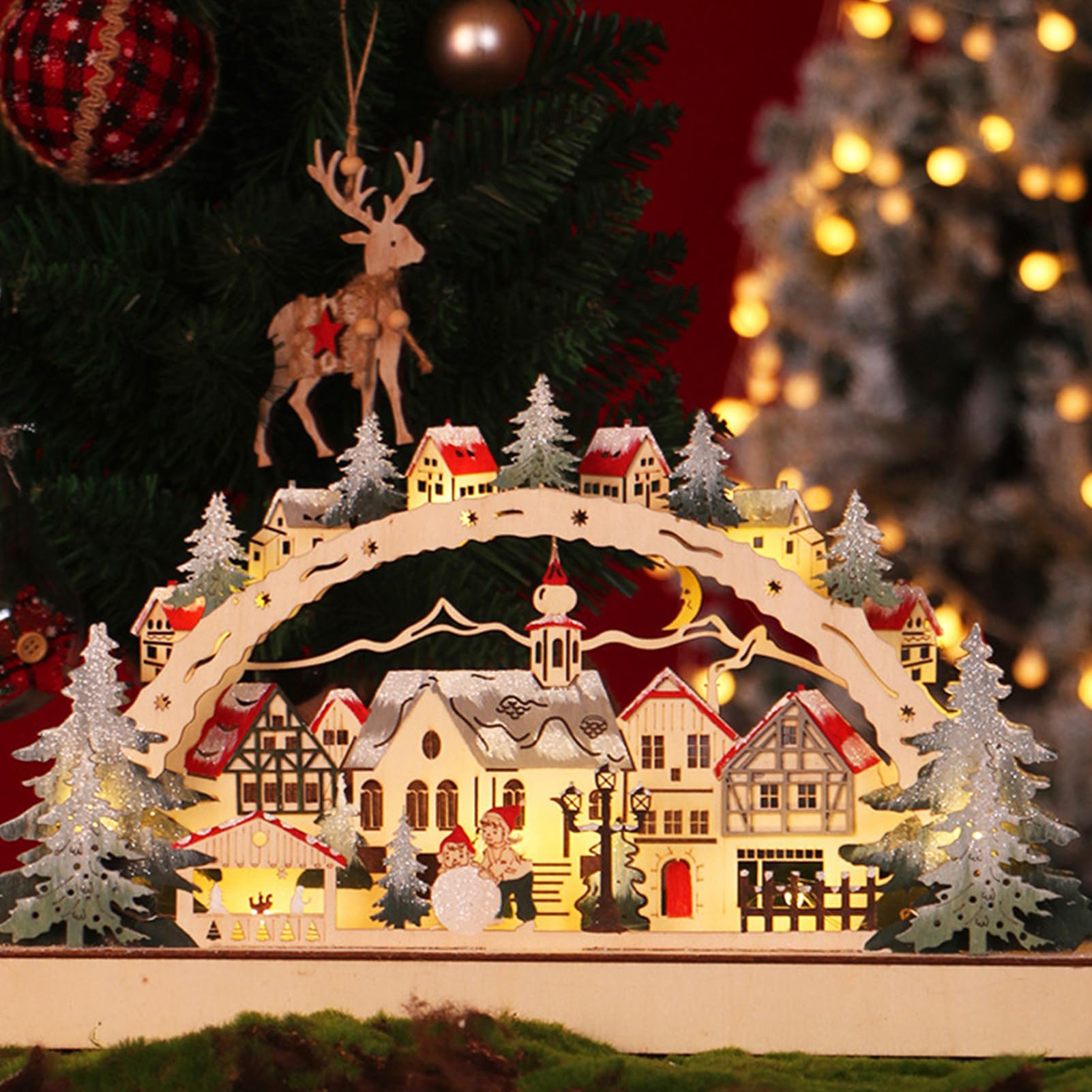 Bezauberndes Weihnachtsdorf mit 3 beleuchteten Häusern! Aus hochwertigem Holz gefertigt, jedes Haus mit eigenem LED-Licht. Wird mit Knopfbatterien betrieben - einfach Schalter umlegen und schon leuchtet es gemütlich. Perfekt für Weihnachtsbaum, Tisch, Kamin oder Fensterbank. Schafft eine wunderbare Weihnachtsstimmung. Auch als Geschenk für Kinder geeignet. Mach dein Zuhause weihnachtlich festlich!