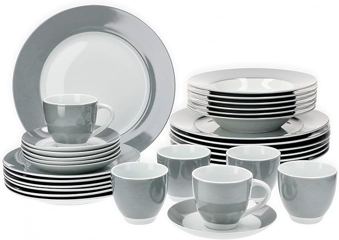 Wow, dieses Geschirrset von MamboCat ist ja richtig hübsch! 30 Teile für 6 Personen - da ist alles dabei was du brauchst: 6 Speiseteller, 6 Suppenteller, 6 Kuchenteller, 6 Kaffeetassen und 6 Untertassen. Das gepunktete Design in Dunkelblau und Weiß sieht total freundlich und modern aus. Aus robustem Porzellan gefertigt, ist das Service spülmaschinen- und mikrowellengeeignet - also super praktisch für den täglichen Gebrauch! Die Tassen mit ihren handlichen Henkeln liegen super in der Hand, und die Teller haben schöne breite Ränder. Perfekt für Frühstück, Mittagessen, Kaffee oder Abendbrot - mit diesem Service macht jedes Essen gleich mehr Spaß! Einfach auspacken, in den Schrank stellen und sich jeden Tag über das schöne Geschirr freuen. Wenn du deine Küche aufpeppen willst oder ein praktisches, schickes Service für die ganze Familie suchst, ist dieses MamboCat Set absolut perfekt!
