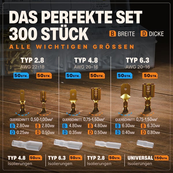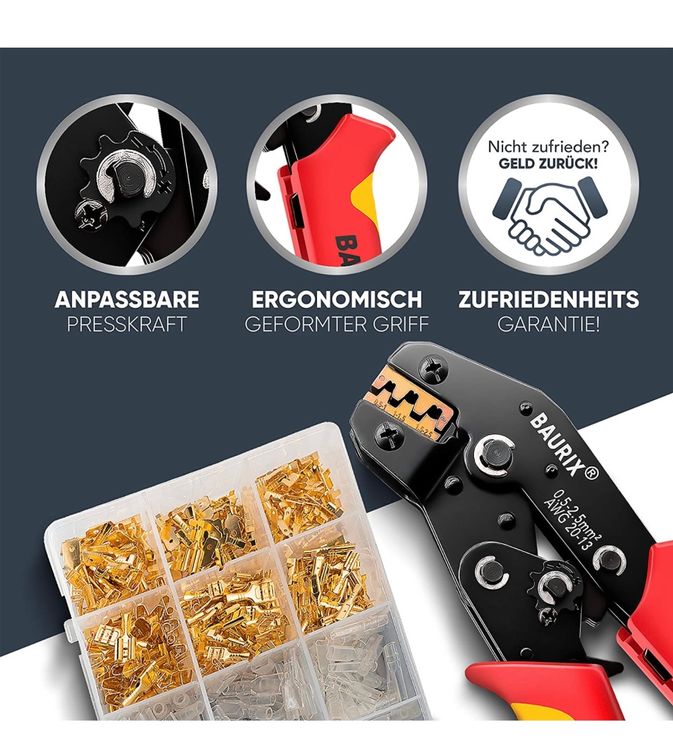 Hey Elektriker und Hobby-Bastler! Dieses APTTOOL Crimpzangen-Set ist genau das, was du brauchst. Die Zange crimpt mühelos Flachsteckhülsen von AWG 20-12 (0,5-2,5mm²) und hat sogar einen Ratschen-Mechanismus für perfekte Crimpungen jedes Mal. Mit dabei sind satte 300 Flachsteckhülsen - da kannst du richtig was schaffen! Der ergonomische Griff liegt super in der Hand und die verstellbare Crimpkraft sorgt für optimale Ergebnisse. Aus hochfestem Kohlenstoffstahl rostfrei gemacht. Ob für Auto-Elektrik, Hausinstallation oder deine DIY-Projekte - mit diesem Set bist du bestens ausgestattet. Einfach Aderendhülse aufstecken, crimpen und fertig - professionelle Ergebnisse garantiert!