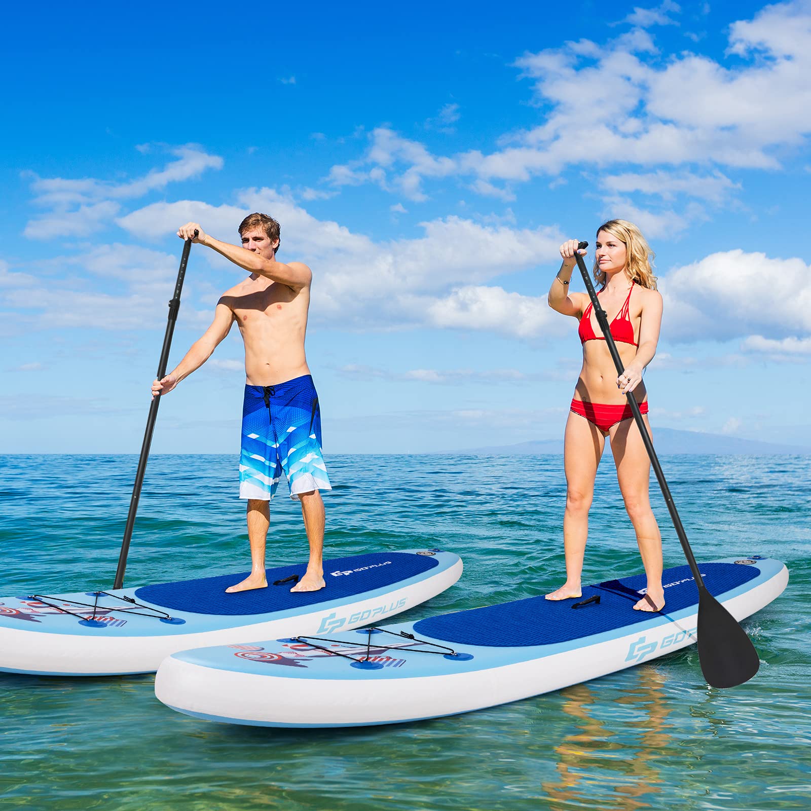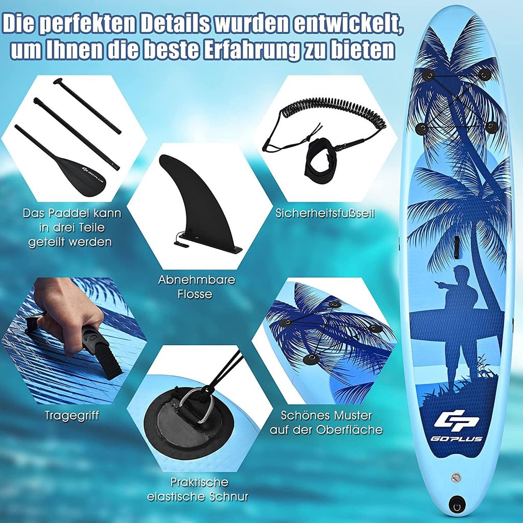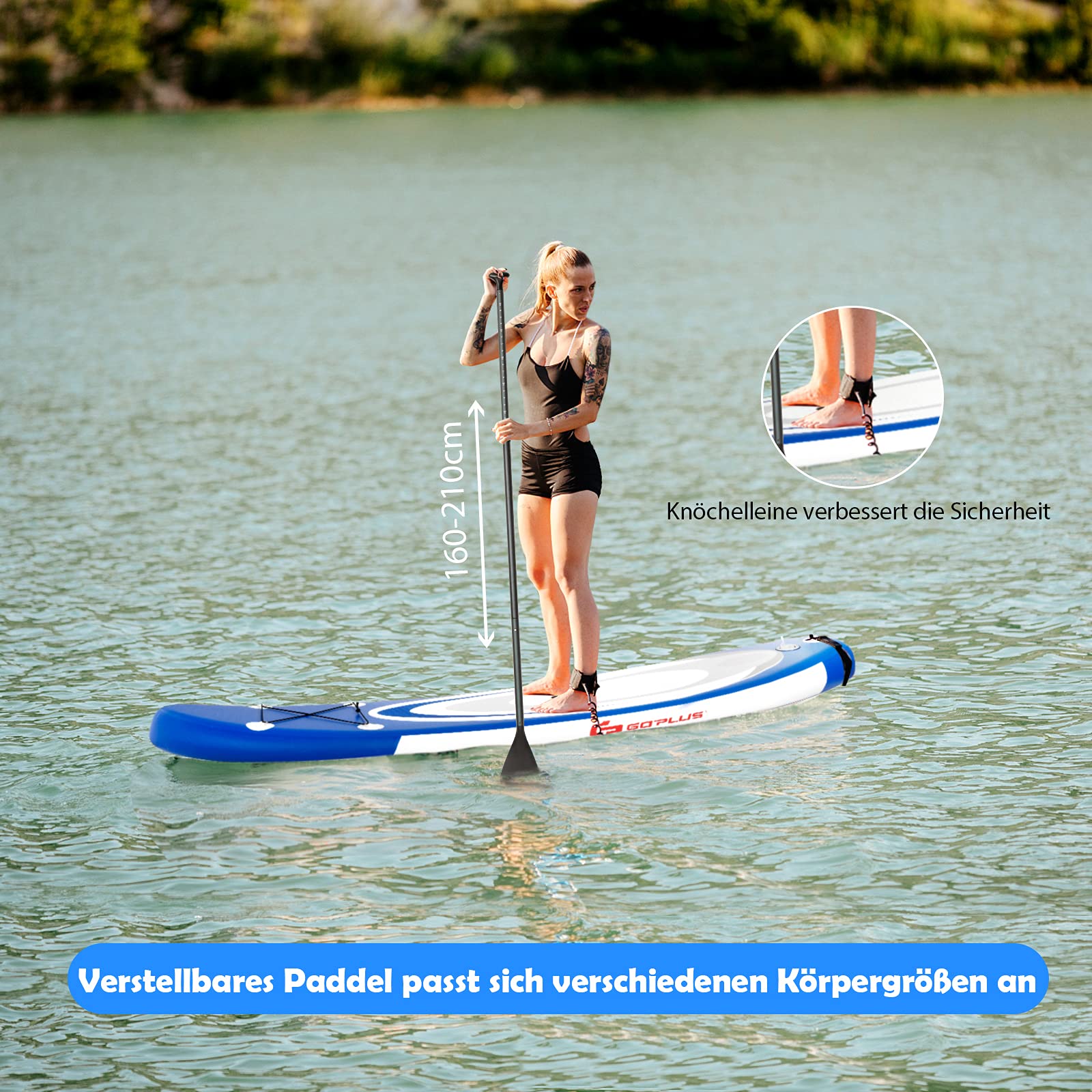 Wow, dieses GOPLUS SUP Board ist perfekt für alle Wasserratten! Mit 305x76x15cm bietet es genug Platz für sicheres Stehen und Paddeln. Aus hochwertigem PVC gefertigt - ultra stabil und langlebig. Das Komplettset enthält alles, was du brauchst: Pumpe, verstellbares Alu-Paddel, Tragetasche und Reparaturset. Perfekt für Einsteiger und Fortgeschrittene! Die D-Ringe und abnehmbare Finne sorgen für zusätzliche Sicherheit und Funktionalität. Einfach aufblasen, ins Wasser und lospaddeln! Nach dem Gebrauch luftleer machen und platzsparend verstauen - ideal für Reisen. Ob für Yoga auf dem Wasser, Touring oder einfach nur zum Entspannen - dieses Board macht Spaß!