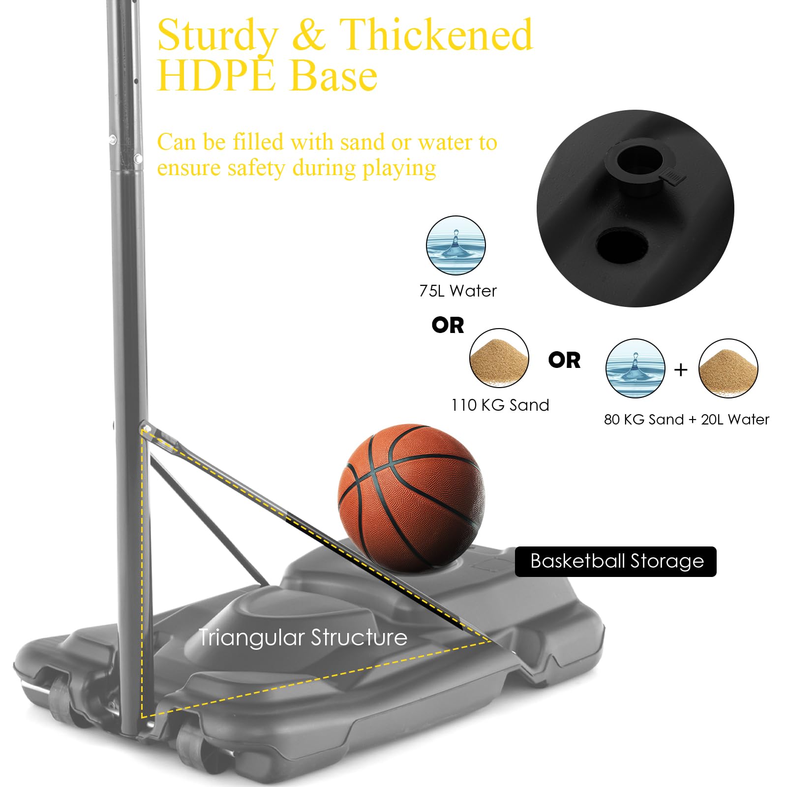 Alter, dieser Basketballkorb von LIFEZEAL ist genau das, was deine Familie braucht! Stell dir vor: Du kannst die Höhe von 130cm bis 305cm in ganzen 12 Stufen verstellen - da haben sowohl die Kleinen als auch die Großen ihren Spaß.🏀\n\nDas absolute Highlight sind die integrierten Rollen! Du kannst den Korb einfach über Rasen, Beton oder Holz bewegen und dir deine persönliche Spielzone suchen. Der stabile, dreieckige Sockel gibt mega Halt, und du kannst ihn mit 75 Litern Wasser oder 110kg Sand befüllen - der steht bombenfest!\n\nDas doppelte Federsystem federt jeden Wurf super ab, und die abgerundeten Ecken sind total sicher für die Kids. Der Korb besteht aus hochwertigem PE-Material und hält auch bei intensivem Spielen ewig.\n\nMit 19,5kg ist er robust, aber trotzdem gut zu bewegen. Die Rückwand misst 110x75cm - also professionelles Feeling pur! Egal ob sonnig oder regnerisch - dieser Basketballkorb macht einfach alles mit. Perfekt für den Garten, die Einfahrt oder die Sporthalle. Kommt komplett mit 2 Netzen und Aufbauanleitung. Worauf wartest du noch? Basketball-Spaß für die ganze Familie!