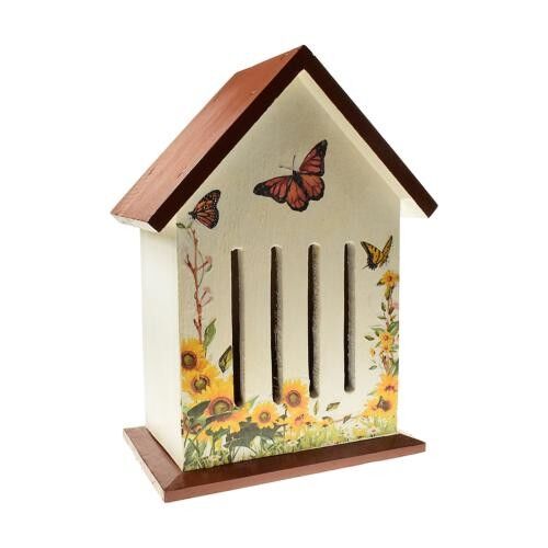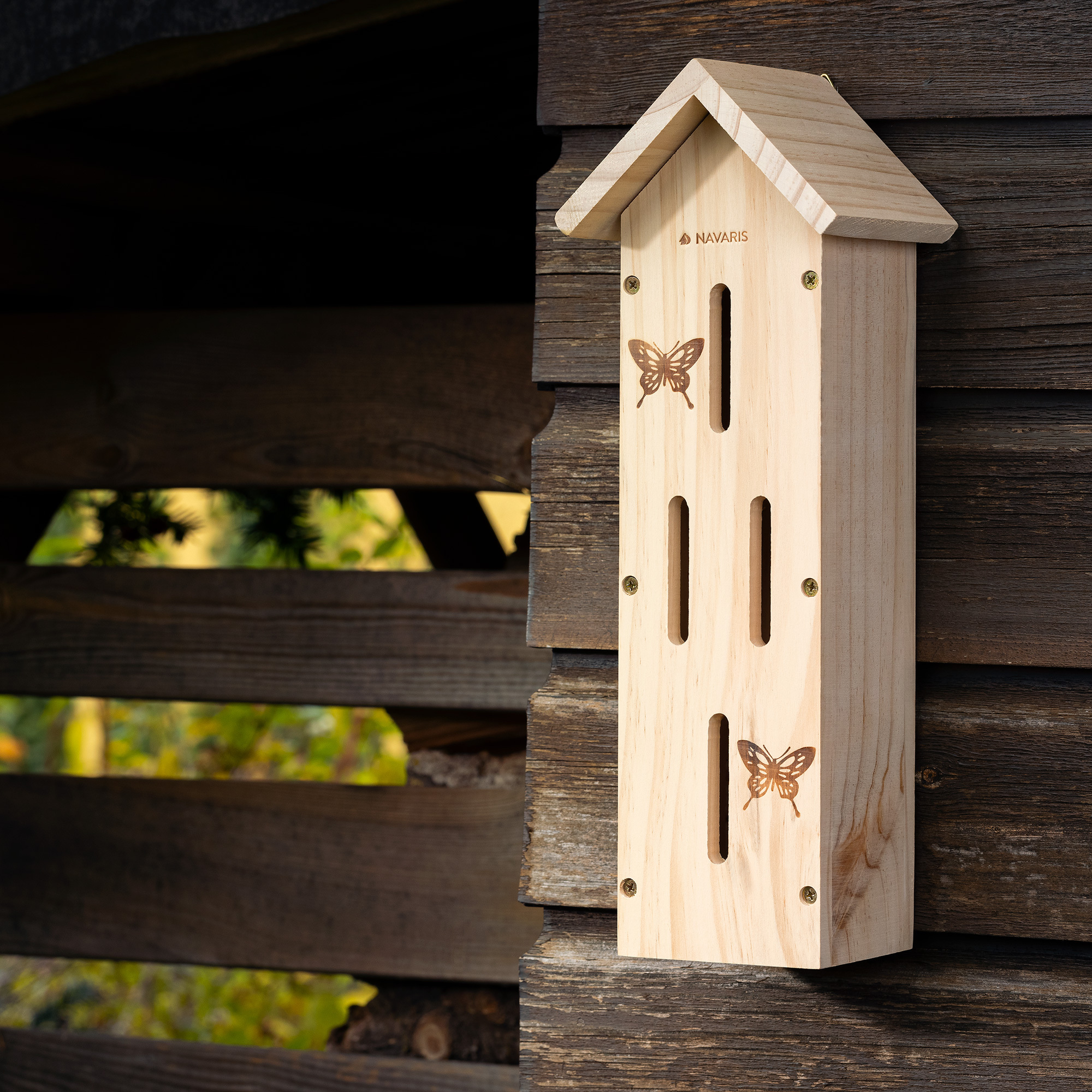 Bring mehr Leben in deinen Garten mit diesem charmanten Schmetterlingshaus! Aus stabilem Holz gefertigt, bietet es den flatternden Besuchern einen sicheren Unterschlupf. Mit ca. 30cm Höhe ist es ein echter Hingucker, ohne zu viel Platz wegzunehmen. Das besondere Feature: Die integrierte Futterstelle! Hier kannst du Obst oder spezielles Schmetterlingsfutter platzieren und so noch mehr bunte Gäste anlocken. Aufhängen oder mit dem beiliegenden Holzstab im Boden befestigen - ganz wie du möchtest. Perfekt für Garten, Terrasse oder Balkon. So kannst du die faszinierenden Tiere aus nächster Nähe beobachten, ohne sie zu stören. Das Haus ist nicht nur dekorativ, sondern leistet auch einen Beitrag zum Naturschutz. Einfach aufstellen und schon bald werden sich die ersten Schmetterlinge einfinden! Mach deinen Outdoor-Bereich zum echten Natur-Paradies.