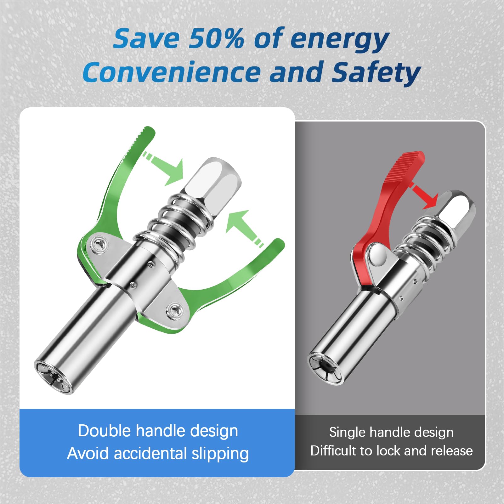 Professionelles Fettpressen-Zubehör für jede Werkstatt! Dieses Komplettset enthält ein Mundstück mit Einhandgriff, 30cm flexiblen Schlauch, 6 M10 Schmiernippel, 90° Winkeladapter und 11mm Kupplung. Das innovative 6-Klauen-Verriegelungssystem hält auch bei hohem Druck bis 12.000 PSI sicher. Einfache Einhandbedienung mit Daumenhebel - perfekt für schwer erreichbare Stellen. Kompatibel mit allen gängigen Fettpressen und ideal für Traktoren, Bagger, Landmaschinen und mehr. Aus legiertem Edelstahl und Eisen - rostfrei und extrem langlebig. Mit konischer Gummidichtung für absolute Dichtheit. Macht jede Schmierung zum Kinderspiel!