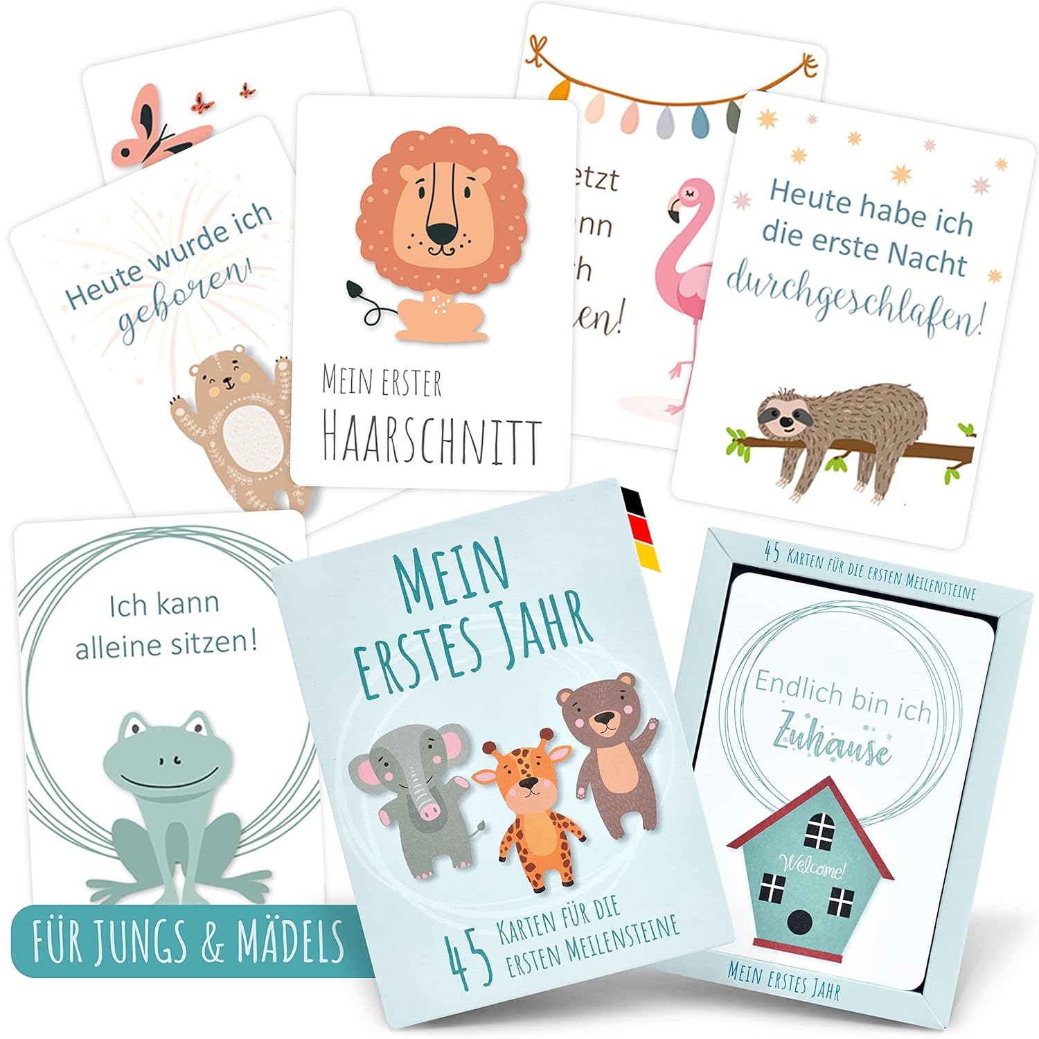 Oh wie süß! Mit diesen talinu Baby Meilensteinkarten hältst du jeden besonderen Moment im ersten Jahr deines Babys fest. 35 liebevoll gestaltete Karten für alle wichtigen Etappen - vom ersten Lächeln über den ersten Zahn bis zum ersten Geburtstag. Einfach Datum draufschreiben, Baby und Karte zusammen fotografieren - und schon hast du eine unvergessliche Erinnerung! Die Karten sind umweltfreundlich, säure- und chlorfrei - also auch fürs Babyalbum geeignet. Kommen in ner praktischen Box, super als Geschenk zur Geburt, Taufe oder einfach so. Großeltern, Tanten, Onkel - alle werden diese persönlichen Fotos lieben! Mach aus normalen Babyfotos echte Erinnerungsschätze!