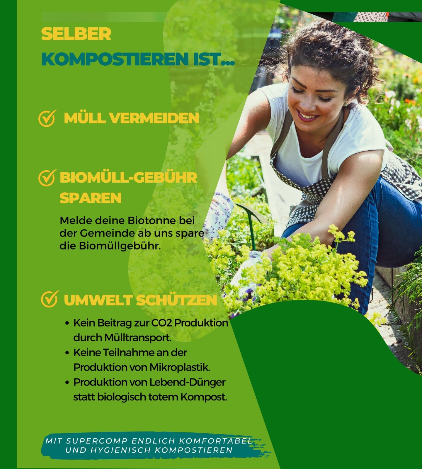 Moin Gartenfreund! Dieser SUPERCOMP Komposter ist der Hammer für alle die kompostieren wollen! Mit 350 Litern Volumen und cleverem Belüftungssystem - kein lästiges Umsetzen mehr! Komplett schädlingssicher mit Dichtungen und Gittern - keine Mäuse, Ratten oder Schnecken mehr im Kompost. Aus UV- und frostbeständigem Polyethylen mit 5 mm Wandstärke - hält ewig! Mit Bodenplatte und werkzeuglosem Stecksystem - in Minuten aufgebaut. Getestet von der TU Graz - kompostiert 3x schneller als normale Komposter. Für Küchen- und Gartenabfälle das ganze Jahr über. Einfach befüllen und dich über guten Kompost freuen!