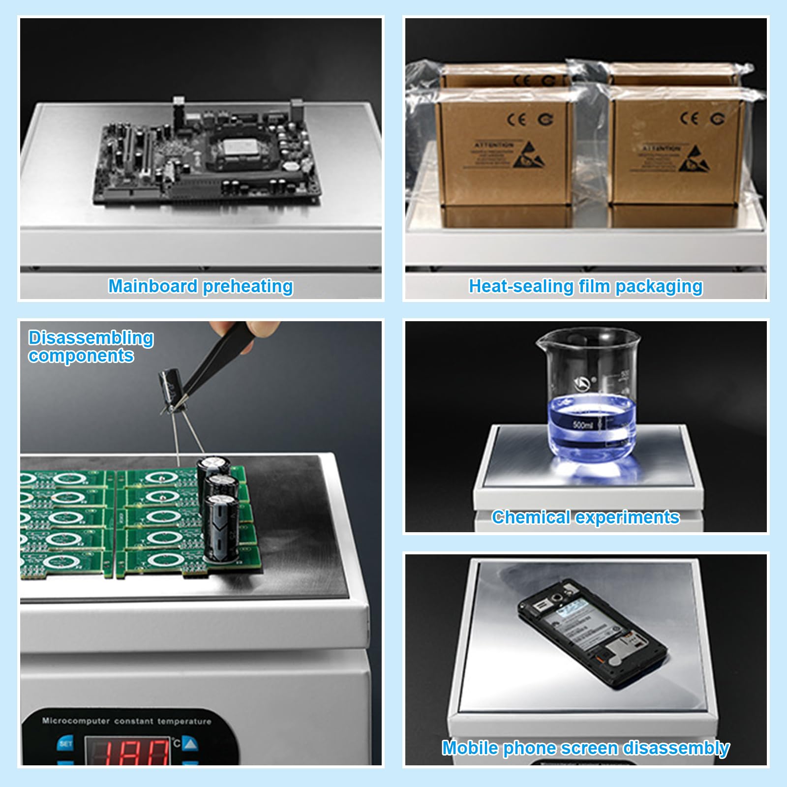 Professionelles Arbeiten war noch nie so einfach! Diese PCB Heizplatte mit 350W Leistung heizt blitzschnell auf - in 5 Minuten auf 300°C! Temperaturbereich von 0-400°C mit präziser LED-Anzeige. Perfekt für Handy-Reparaturen, Leiterplattenschweißen, LED-Arbeiten und mehr. Aus Aluminiumlegierung für gleichmäßige Wärmeverteilung. Lüfterlose Kühlung - super leise! Überlastschutz sorgt für Sicherheit. Kompakte 10x10 cm Bauweise, randisoliert gegen Verbrennungen. Einfache Temperaturvoreinstellung mit Speicherfunktion. Ideal für Werkstätten, Labore oder ambitionierte Heimwerker. Endlich präzise Temperaturkontrolle für deine Elektronik-Projekte!