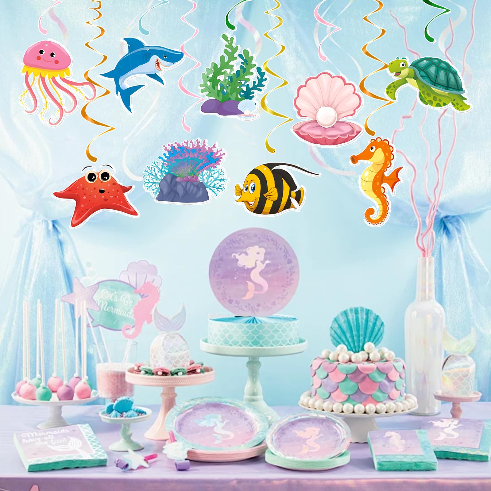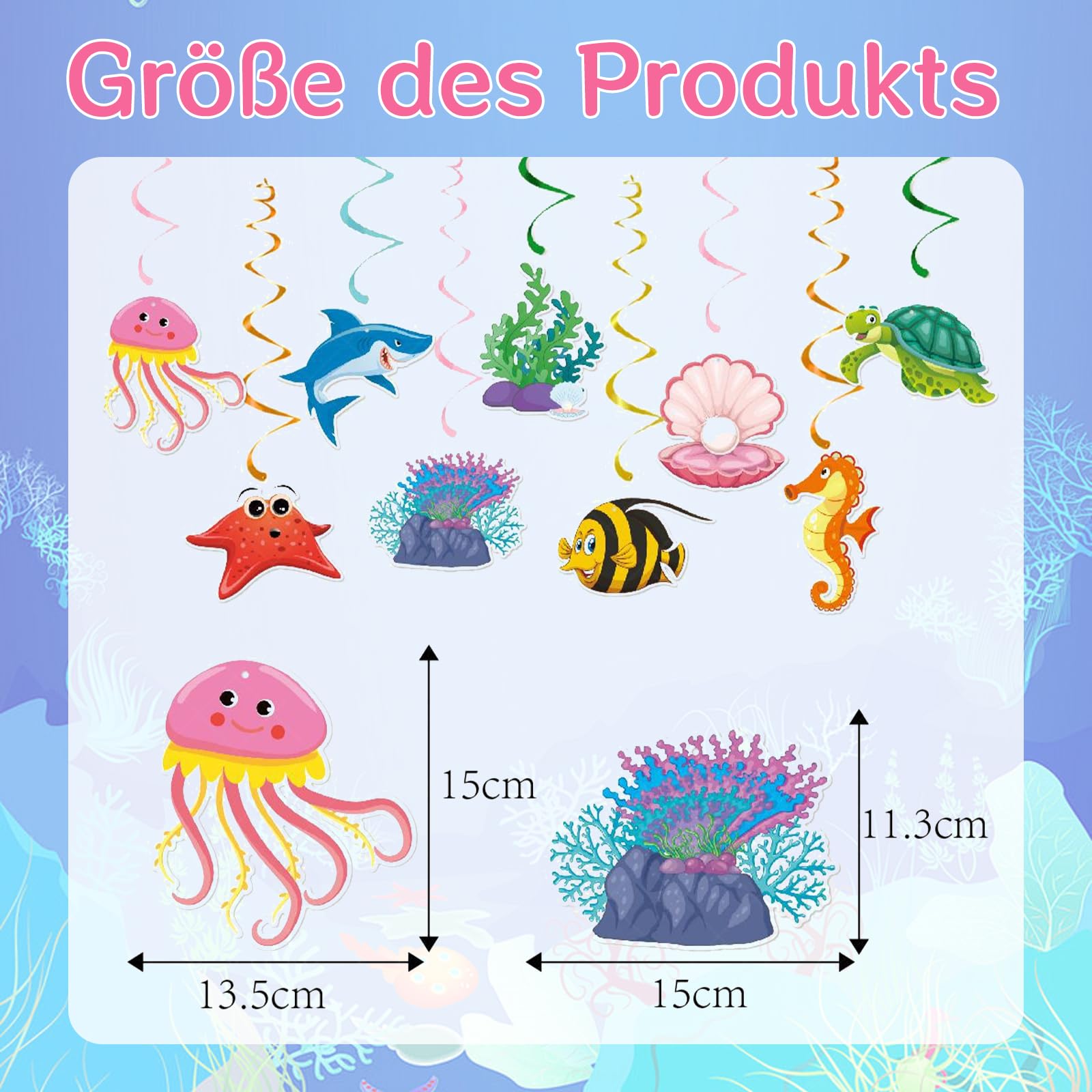 Tauch ein in eine magische Unterwasserwelt! Mit diesen 36 bunten Meerestier-Dekorationen verwandelst du jede Party in ein ozeanisches Fest. Die süßen Fische, Seepferdchen und Muscheln sind super einfach aufzuhängen und sehen an der Decke einfach fantastisch aus. Perfekt für Geburtstage, Babypartys, Hochzeiten im Meeresthema oder einfach um dein Zuhause in eine bunte Unterwasserwelt zu verwandeln. Aus hochwertigem Papier gefertigt - leicht, bunt und wiederverwendbar. Deine Gäste werden begeistert sein von dieser fröhlichen Meeresdekoration!