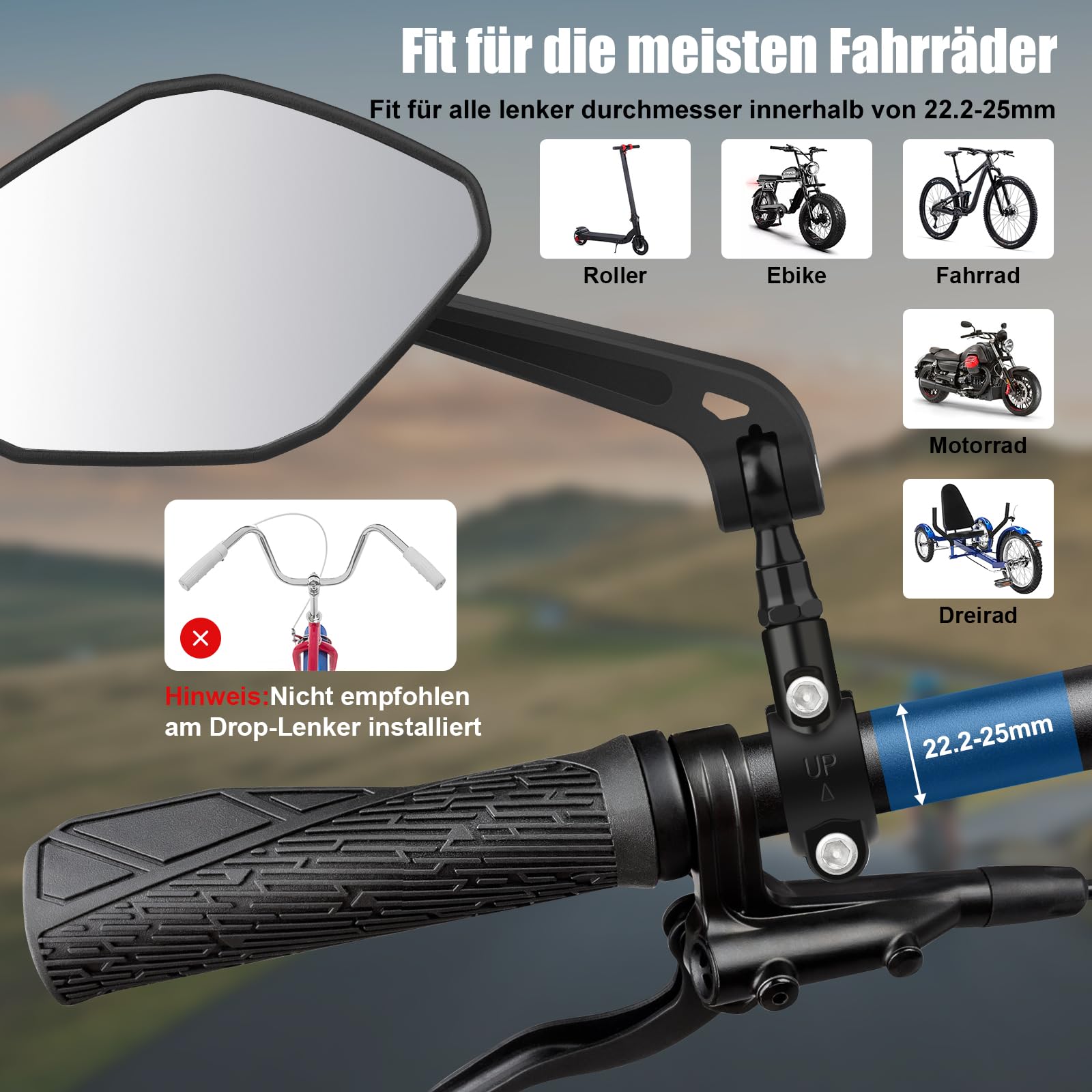 Radfahrer - mehr Sicherheit geht nicht! Dieser Fahrradspiegel für links am Lenker gibt dir den perfekten Überblick. 15 cm großes Sichtfeld - siehst alles was hinter dir passiert. 360° drehbar - stell ihn dir genau so ein, wie du ihn brauchst. Stoßfest - wackelt nicht mal auf holprigen Wegen. Passt auf Lenker von 20-24 mm Durchmesser - für Mountainbikes, E-Bikes, Scooter. Aus ABS und Aluminium - super stabil und langlebig. Kratzfest - bleibt auch nach Monaten noch klar. Einfach zu montieren - Werkzeug included. Fünfeckiges Design - sieht mega stylisch aus. Fahr sicherer - behalte den Verkehr immer im Blick!