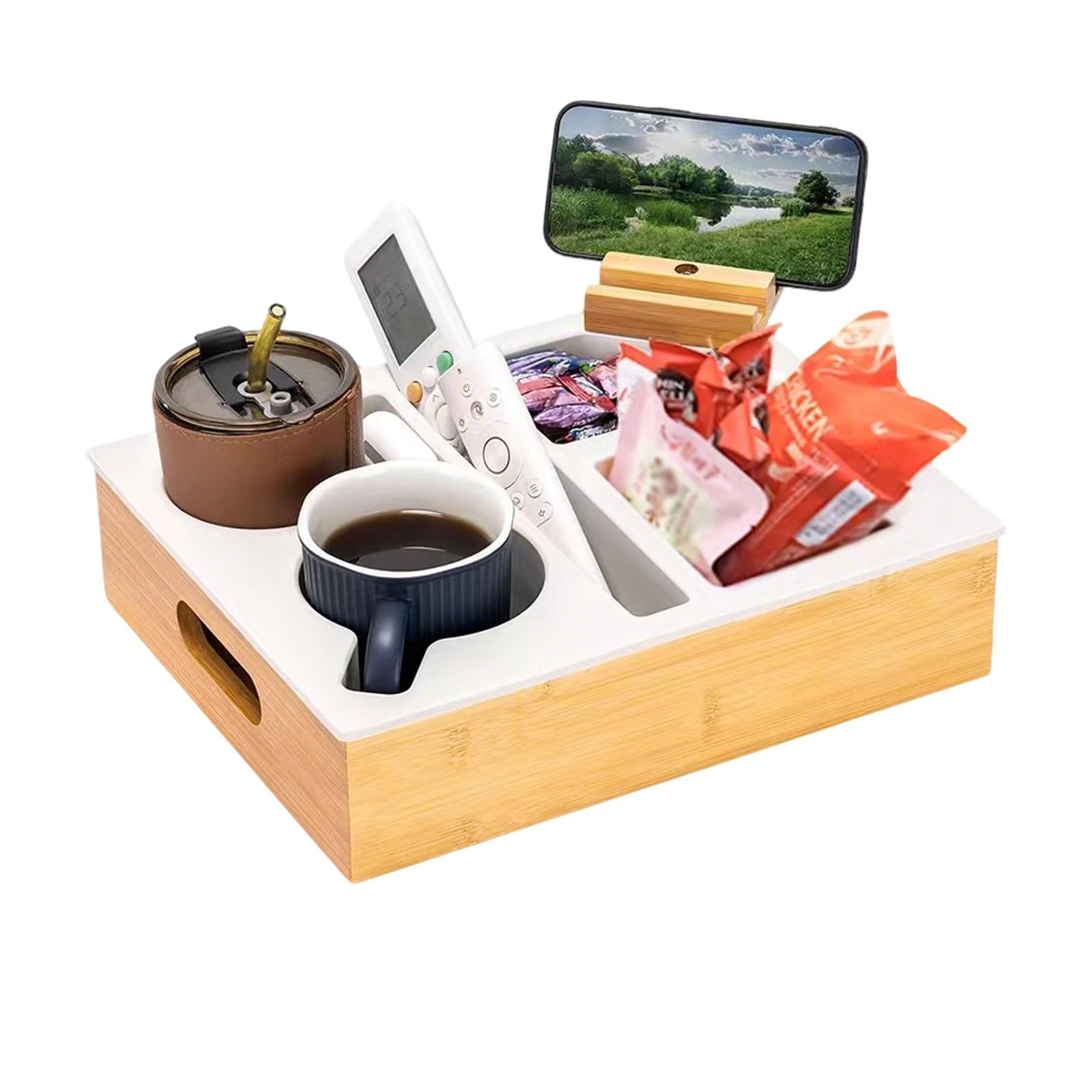 Maße: 27x27x7,5cm. Aus Holz mit abnehmbaren Silikonteilen - wasserdicht und spülmaschinenfest. Getränkehalter, Snackschale und Stauraum für Fernbedienung in einem!