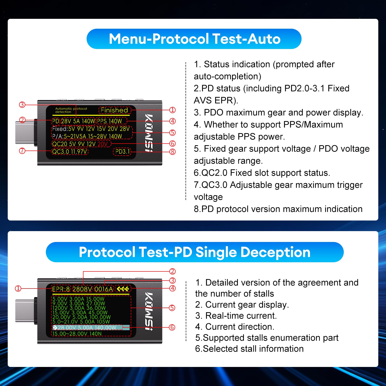 Erkennt automatisch alle gängigen Schnellladeprotokolle: PD3.1, QC4.0, MTK und viele mehr. So siehst du sofort, ob dein Ladegerät das Maximum rausholt.
