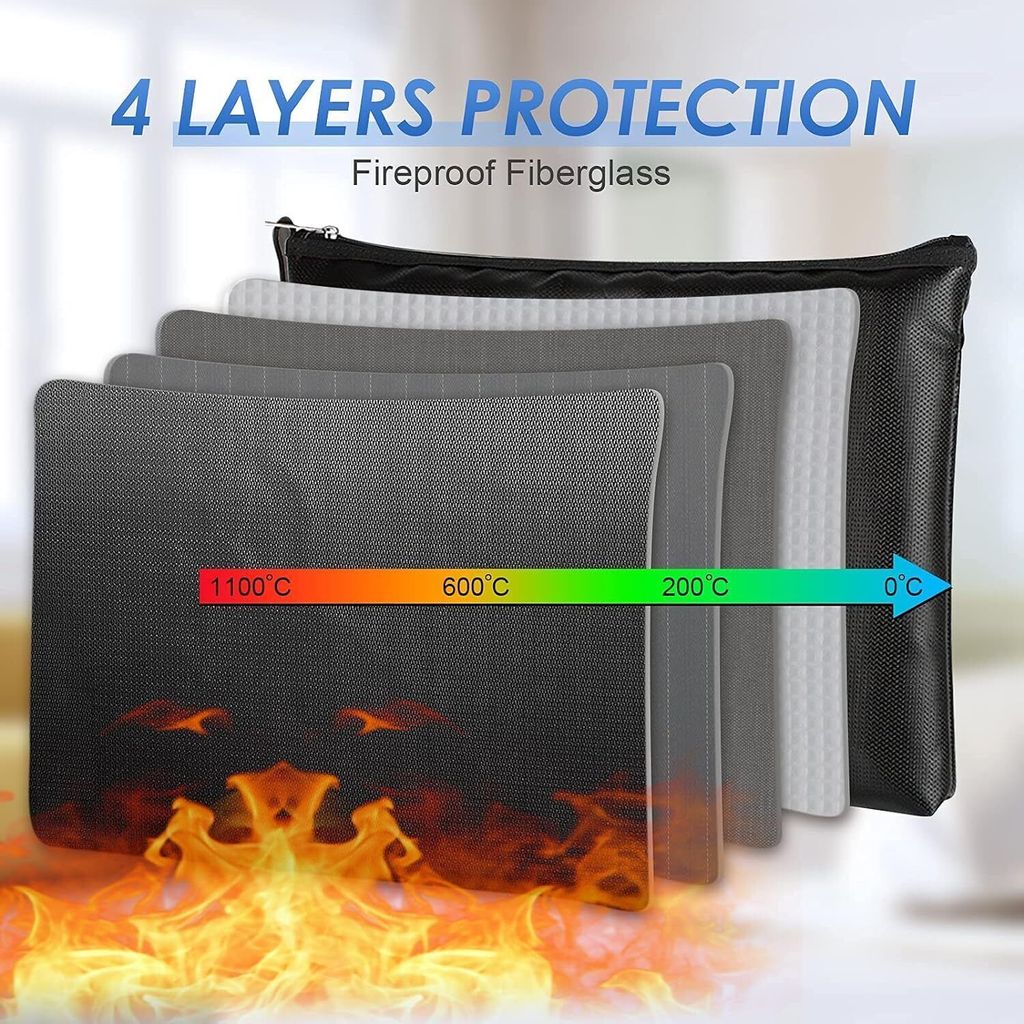 Schütze deine wichtigsten Dokumente vor Feuer und Wasser! Dieses 3er-Set feuerfester Taschen bietet optimalen Schutz für Pass, Geld, Urkunden und andere Wertsachen. Das dreischichtige Fiberglas-Material hält Temperaturen bis zu 1200°C stand. Die silikonbeschichtete Oberfläche ist wasserdicht und die Reißverschlüsse sowie Nähte sind feuerhemmend. In drei praktischen Größen für unterschiedliche Dokumente - perfekt für A4-Unterlagen. Ideal für zu Hause, im Büro oder auf Reisen. Einfach Dokumente einlegen, Reißverschluss schließen und sicher verwahren. Deine wichtigsten Papiere sind so bestens geschützt!