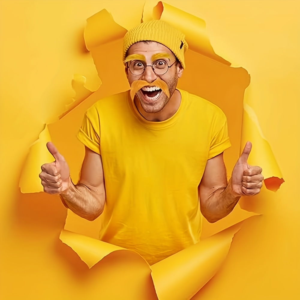 Verwandele dich in Minuten! Diese lustigen Fake-Augenbranen und Bärte sind der Hit für jede Party. Im Set bekommst du 2 Bärte (16x8 cm) und 2 Augenbrauen-Paare (8x2 cm) in Orange und Gänsegelb.