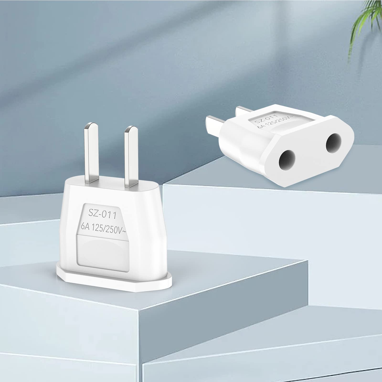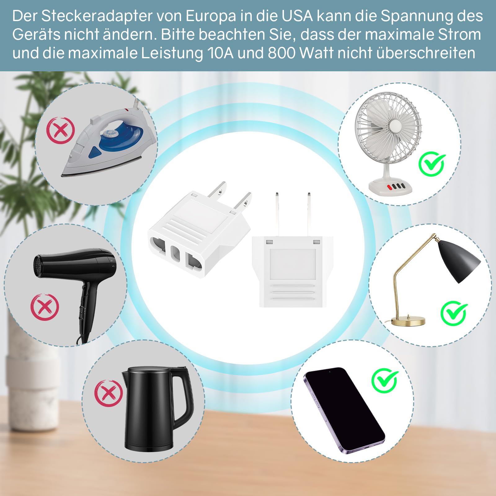 Perfekt vorbereitet für deine nächste Reise! Dieses Set mit 4 Reiseadaptern wandelt europäische Stecker (2 runde Stifte) in US-Stecker (flache Stifte) um. Aus feuerfestem Polykarbonat mit Kupferleitern für maximale Sicherheit. Verträgt 125-250V und 6A - ideal für Laptops, Smartphones, Rasierer und andere Kleingeräte. Super kompakt und leicht - passt in jedes Reisegepäck. Wichtig: Dies sind nur Adapter, keine Spannungswandler! Geeignet für USA, Kanada, Japan, China, Mexiko und andere Länder mit US-Steckern. Einfach in die Steckdose stecken und deine Geräte anschließen. Mit 4 Stück im Set hast du immer Ersatz parat oder kannst Familie und Freunde mitversorgen. Nie wieder Probleme mit fremden Steckdosen!