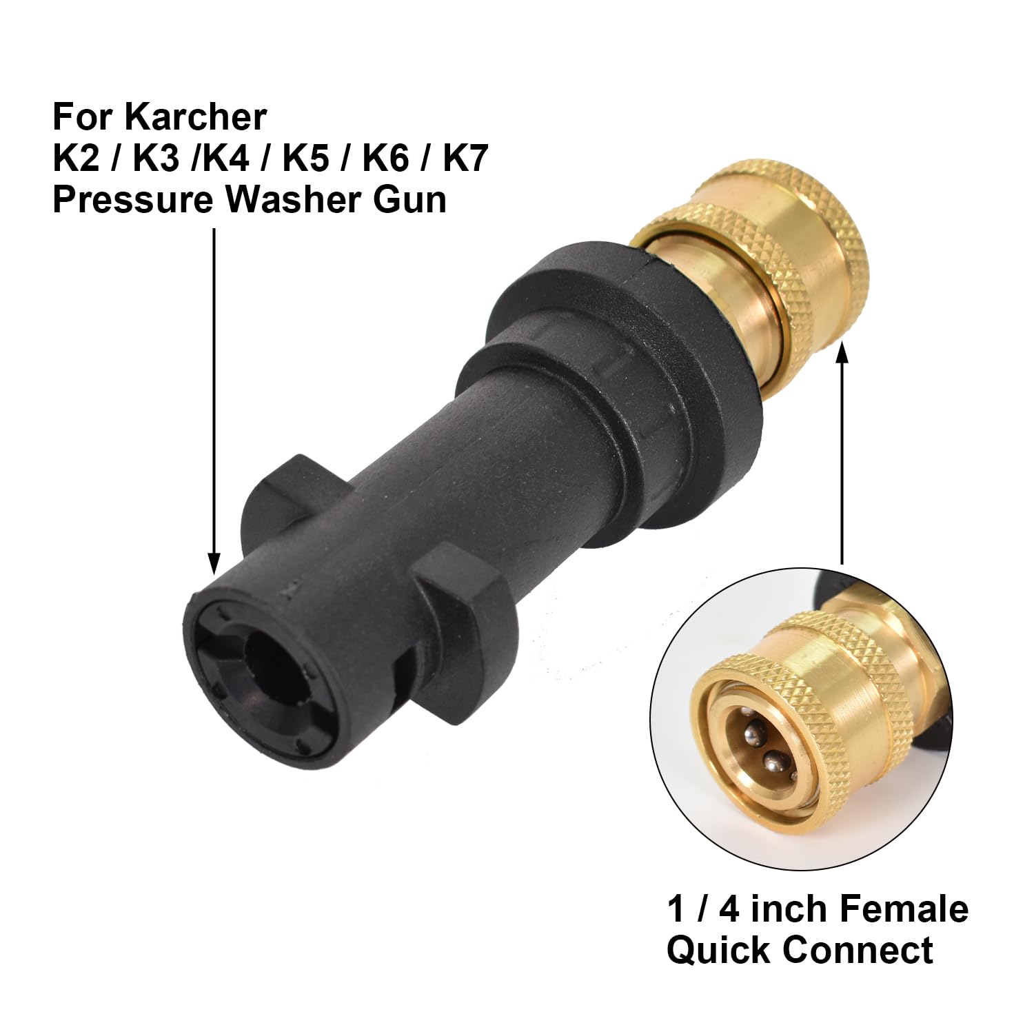 Mach deinen Kärcher Hochdruckreiniger noch vielseitiger! Dieser praktische Adapter mit 1/4 Zoll Schnellkupplung passt perfekt für die Modelle K2, K3, K4, K5, K6 und K7. Einfach in die Pistole eindrehen und schon kannst du verschiedenste Aufsätze wie Schaumkanonen, Rotationsdüsen oder Lanzen anschließen. Die Messing-Buchse ist super robust und hält sogar bis zu 2000 PSI Druck stand. Temperaturen bis 60°C sind auch kein Problem. Die Installation ist kinderleicht - kein Werkzeug nötig! Einfach eindrehen und loslegen. Ob Auto waschen, Terrasse reinigen oder Gartenmöbel säubern - mit diesem Adapter wird dein Kärcher zum echten Allround-Talent. Achtung: Nicht kompatibel mit K1700, K1800, K1900 oder K2000 Modellen. Hol dir mehr Flexibilität für deine Reinigungsarbeiten!