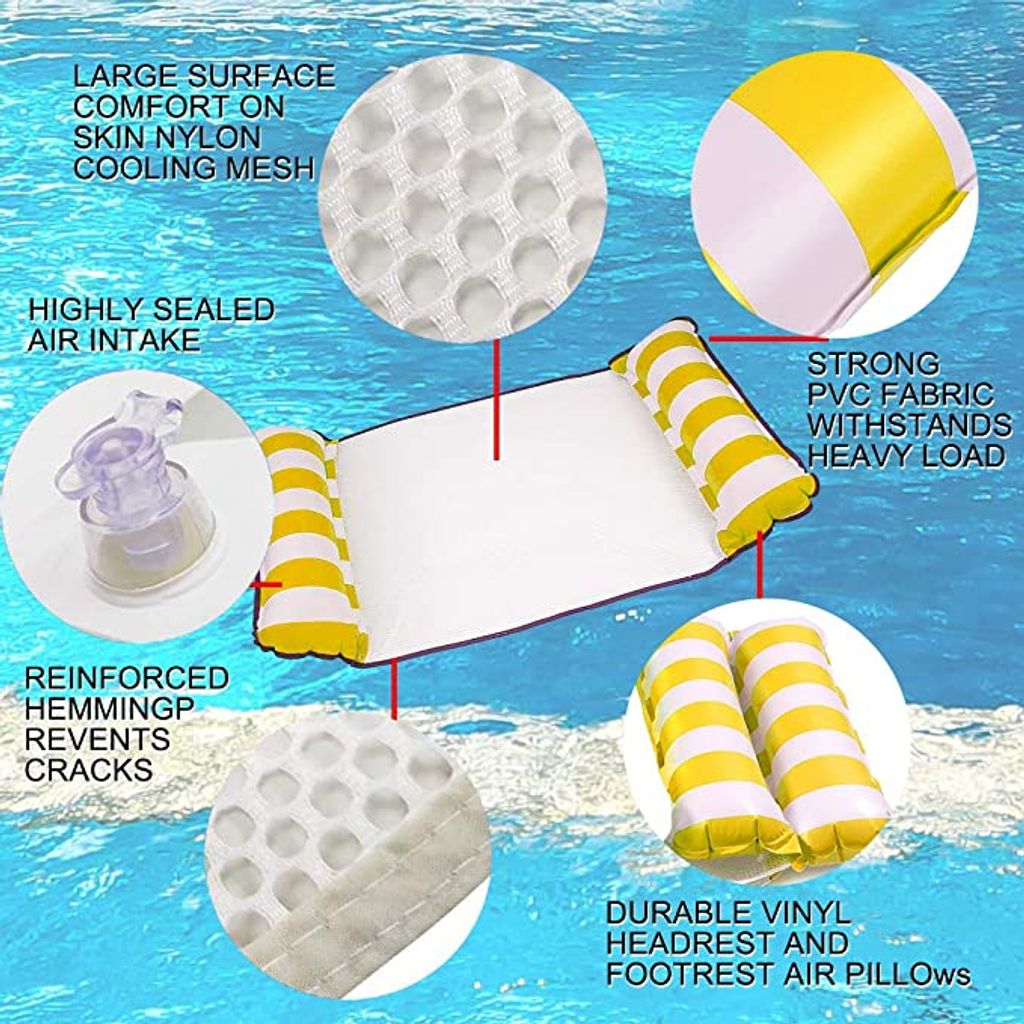 Endlich mal was Anderes für den Strandurlaub! Dieses aufblasbare Schwimmbett ist ein echter Allrounder: Hängematte, Liegestuhl, Treibkissen und Sportsattel in einem. Aus robustem PVC, schnell aufgebaut mit der beiliegenden Luftpumpe. Maße: 130x80x15 cm und trägt bis zu 200 kg! Das Netz ist weich und trocknet schnell, die Kissen an den Enden geben extra Komfort. Zusammenklappbar - passt in jede Strandtasche. Perfekt für Pool, Meer oder See. Aber Achtung: Kinder nur unter Aufsicht verwenden! Mach deinen Sommerurlaub unvergesslich mit diesem praktischen Begleiter.