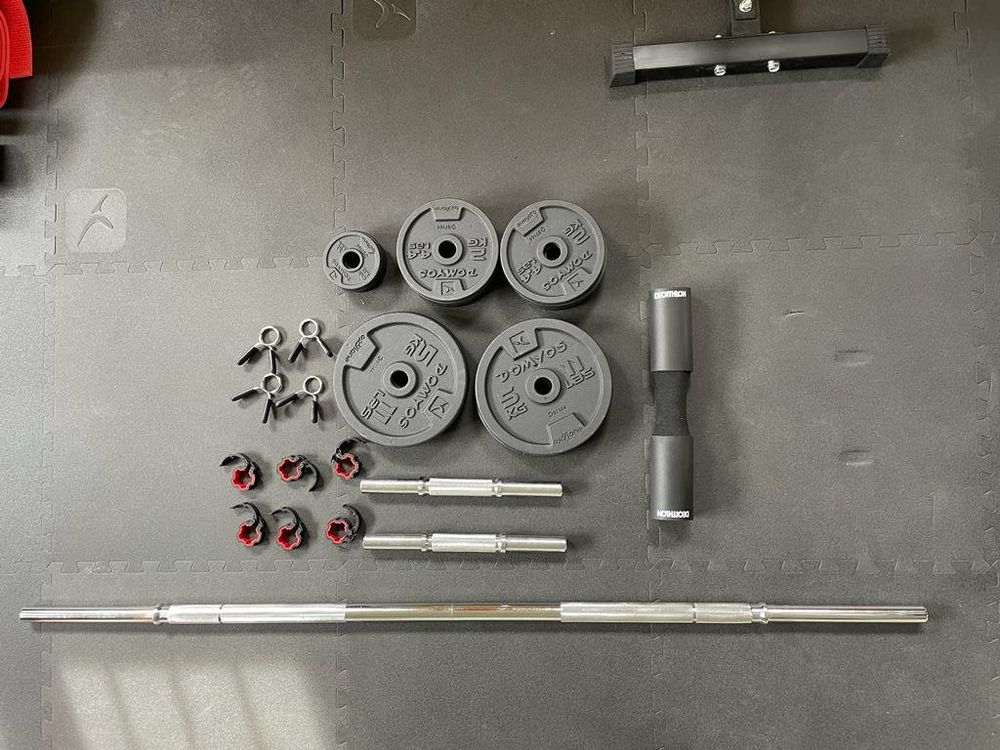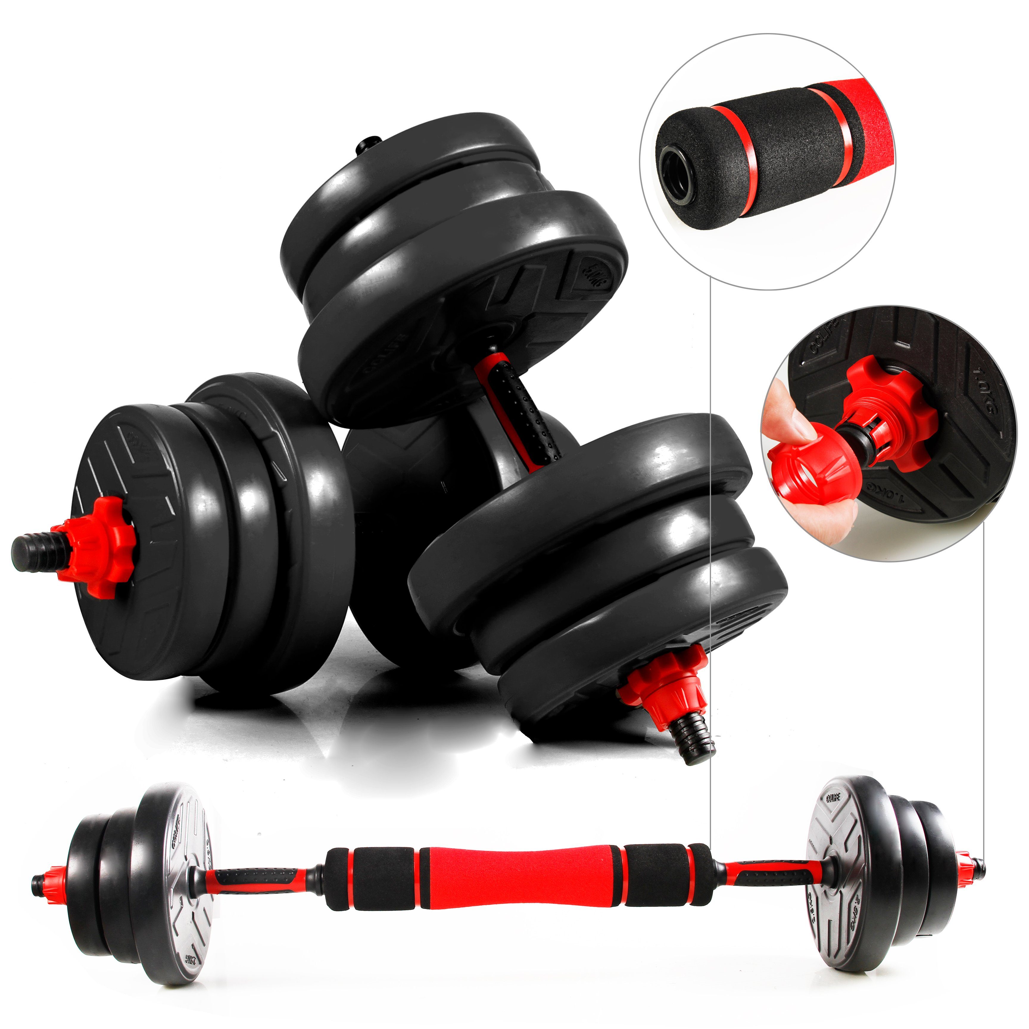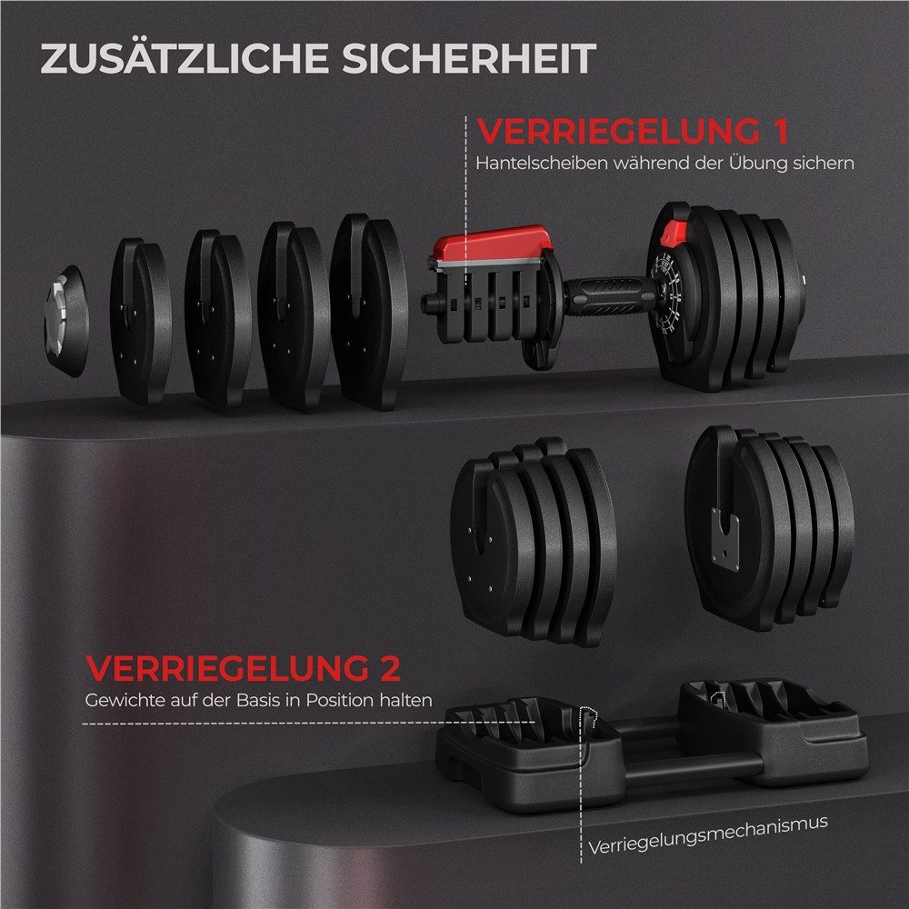 Boah, ist das praktisch! Dieses 4-in-1 Hantel-Set ersetzt dir gleich ein ganzes Home-Gym. Mit 40kg Gesamtgewicht und verstellbaren Einzelgewichten trainierst du wirklich jeden Muskel.\\n\\nDas geniale Multifunktions-System:\\n• Als Langhantel für Beine, Rücken und Brust\\n• Als Kurzhanteln für Arme und Schultern\\n• Als Kugelhantel für Schwungübungen\\n• Als Liegestütz-Ständer für mehr Tiefe\\n\\nDie rutschfeste Griffoberfläche gibt dir perfekten Halt und die verstärkten Muttern sorgen für absolute Sicherheit beim Training. Kein Verrutschen, kein Lockern - einfach sicher trainieren!\\n\\nAus hochwertigen Materialien gefertigt, ist das Set super langlebig und schont dabei noch deine Böden. Der Aufbau ist kinderleicht - innerhalb weniger Minuten hast du deine gewünschte Konfiguration zusammengestellt.\\n\\nNach dem Training einfach zerlegen und platzsparend verstauen. Perfekt für kleine Wohnungen oder wenn du nicht viel Stauraum hast.\\n\\nOb für Anfänger oder Fortgeschrittene, für Muskelaufbau oder Fitnesstraining - dieses Set wächst mit deinen Ambitionen mit. Dein komplettes Krafttraining in einem Set - mehr brauchst du nicht!