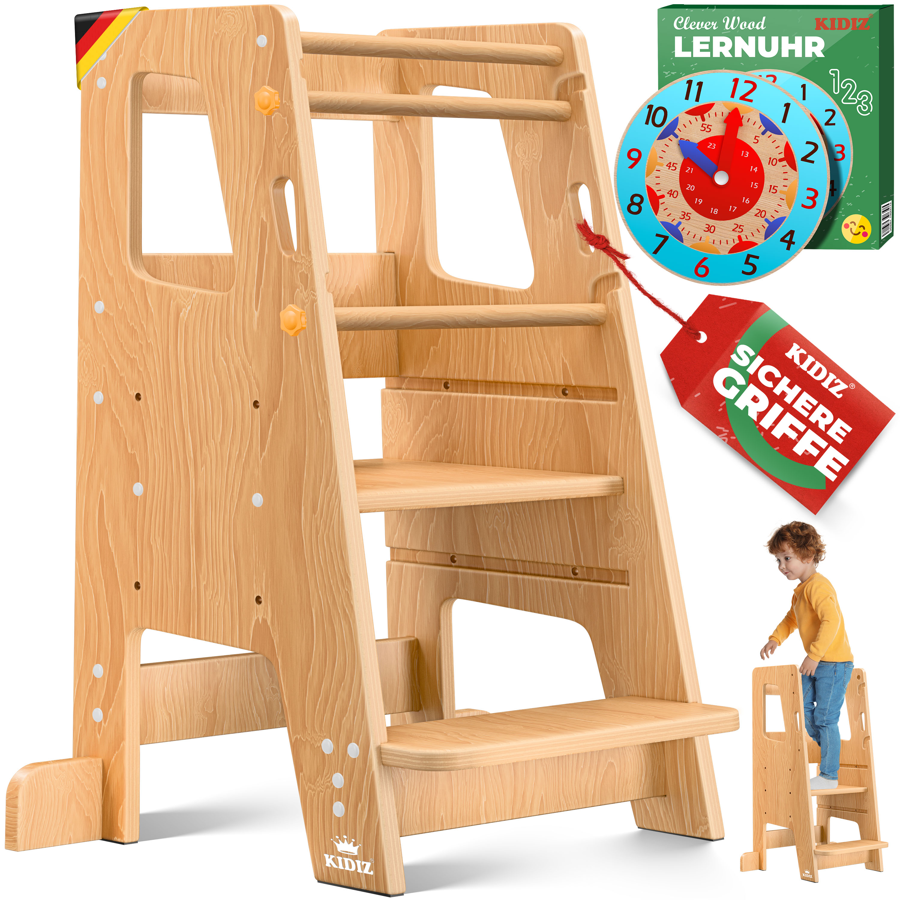 Der perfekte Helfer für dein Kind: Dieser 4-in-1 Lernturm ab 1 Jahr ist ein echter Alleskönner! Aus stabilem Kiefernholz, trägt bis zu 68 kg und hat nen abnehmbaren Sicherheitsbügel für extra Schutz. Die A-Rahmen-Konstruktion kippt nicht, und alle Kanten sind glatt geschliffen. Besonders cool: Er hat ne integrierte Tafel für kreatives Malen und ne Lernuhr mit Zahlen - so lernen Kinder spielerisch Uhrzeit und Zahlen. Noch besser: Du klappst ihn blitzschnell zu nem Tisch-Set um! Perfekt für die Küche, damit dein Kind dir helfen kann, oder zum Spielen und Lernen. Fördert Feinmotorik, Selbstständigkeit und Kreativität. Ein super Geschenk für Kinder von 1-3 Jahren. Einfach aufbauen in ca. 20 Minuten, Werkzeug ist dabei. Mach deinem Kind eine Freude und gib ihm die Möglichkeit, überall dabei zu sein! Einfach genial für neugierige Kleinkinder. Ein Montessori-Traum, der mitwächst und immer wieder neue Möglichkeiten bietet. Einfach praktisch und pädagogisch wertvoll!