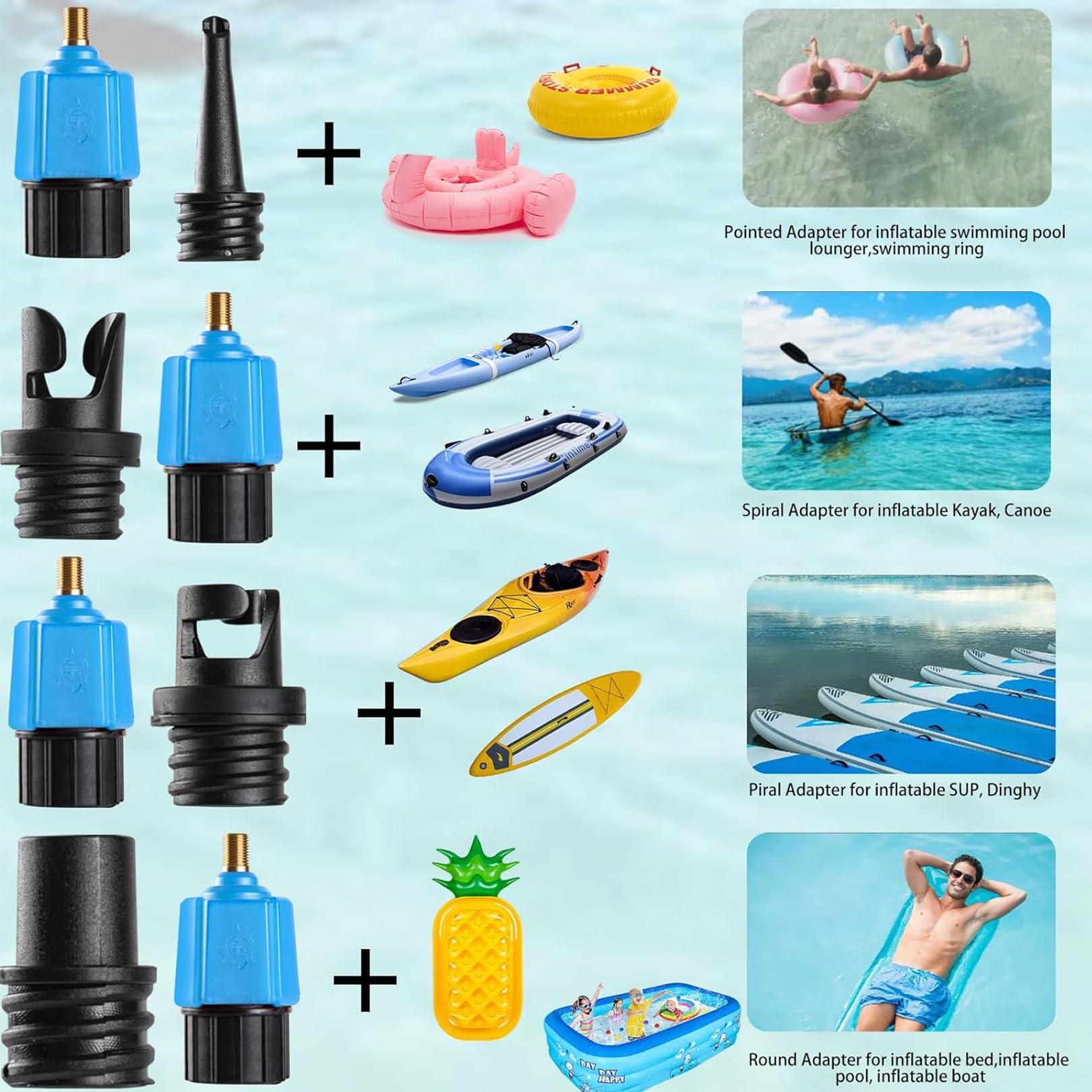 Endlich ein Adapter, der wirklich ALLES kann! Dieses 4-in-1 Set passt auf praktisch jedes aufblasbare Sportgerät: SUP-Boards, Kajaks, Schlauchboote, Luftmatratzen - du nennst es, dieser Adapter pumpt es auf! Die verschiedenen Düsen garantieren eine absolut dichte Verbindung ohne lästiges Luftverlust. Aus robustem, wasserbeständigem Kunststoff gefertigt, hält der Adapter jahrelang. Super leicht (nur 24g) und kompakt - perfekt für unterwegs! Einfach die passende Düse auswählen, aufstecken und lospumpen. Funktioniert mit Handpumpen, Fußpumpen und elektrischen Pumpen. Material: Kunststoff • Gewicht: 24g • 4 verschiedene Aufsätze • Für SUP-Boards, Kajaks, Schlauchboote, Luftmatratzen • Kompatibel mit allen gängigen Pumpen