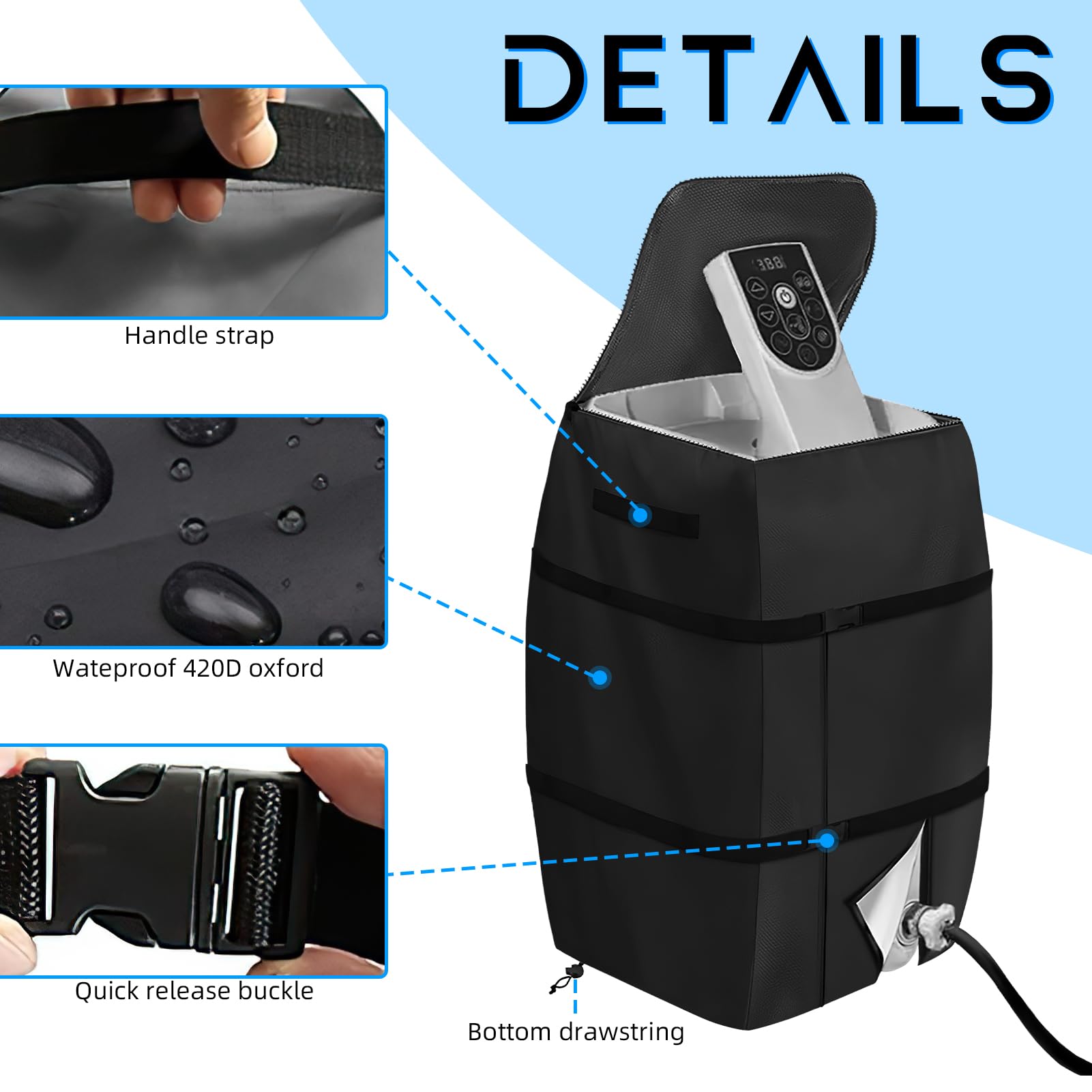 Schütze deine Whirlpool-Pumpe mit dieser robusten Abdeckung! Aus wasserdichtem Oxford-Stoff - hält Regen, Schnee und Sonne stand. Maße 43x38x54cm passen für die meisten quadratischen Pumpen. Mit Klettverschlüssen für sicheren Halt auch bei starkem Wind. Einfach über die Pumpe stülpen und verschließen - keine Demontage nötig! Schützt vor Witterung, Staub und verlängert die Lebensdauer deiner Pumpe. Wenn nicht gebraucht, einfach zusammenfalten und verstauen. Ein Muss für jeden Whirlpool-Besitzer - deine Pumpe bleibt trocken und funktionsbereit!