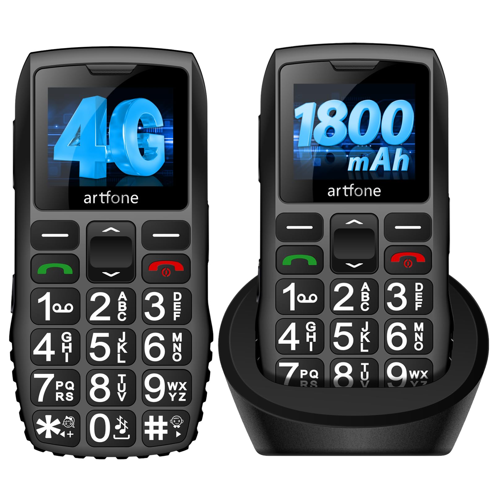 Das perfekte Handy für Senioren und Technik-Einsteiger! Das artfone 4G Seniorenhandy mit extra großen Tasten und übergroßer Schrift ist einfach zu bedienen. Ohne Vertrag nutzbar bei allen deutschen Netzbetreibern.\\n\\nMit praktischer SOS-Taste für Notfälle - bis zu 5 Nummern speicherbar. Die 1800mAh Batterie hält bis zu 12 Tage im Standby! Mit USB-C Anschluss und inklusive praktischer Ladestation.\\n\\n1,77 Zoll Farbdisplay, Bluetooth, Radio, Taschenlampe und Wecker - alles was man braucht! Keine komplizierte Kamera, dafür umso einfachere Bedienung.\\n\\nEinfach auf die Ladestation schieben zum Aufladen - kein lästiges Kabel einstöpseln. Das rutschfeste Design liegt sicher in der Hand. Perfekt für ältere Menschen und Sehbehinderte!