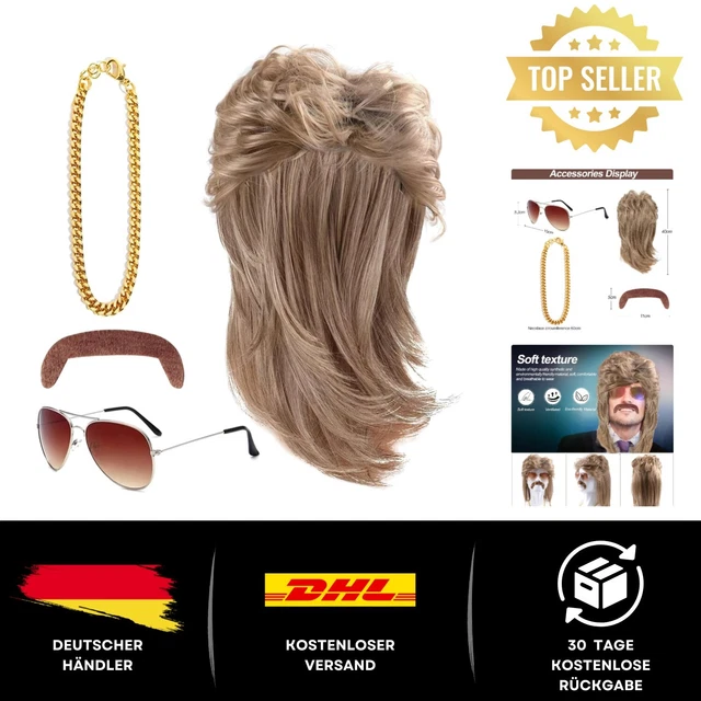 Achtung, 80er Jahre Alarm! Dieses Vokuhila-Perücken-Set ist der absolute Hit für jede Faschingsparty, Karneval oder 80er Jahre Motto-Party! Im Set enthalten: 1x blonde Vokuhila-Perücke, 1x übertrieben große Goldkette, 1x stylische Sonnenbrille und 1x falscher Bart - also alles, was du für den perfekten 80er Look brauchst! Die Perücke hat dieses typische Mullet-Design: vorne kurz, hinten lang - einfach ikonisch! Sie ist super leicht, hat ein verstellbares Mesh-Kopfteil für perfekten Sitz und lässt sich bei Bedarf sogar trimmen. Ob für Herren oder Damen - dieses Set passt für jeden und bringt garantiert jede Menge Lacher und Komplimente! Perfekt für Halloween, Karneval, Geburtstagsfeiern oder einfach mal für einen verrückten Abend. Mit diesem Outfit wirst du definitiv zum Mittelpunkt jeder Party! Also worauf wartest du? Hol dir den Spirit der 80er zurück und mach jede Party zu einem unvergesslichen Event! Achtung: Wegen Kleinteilen nicht für Kinder unter 6 Jahren geeignet.