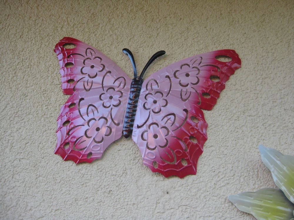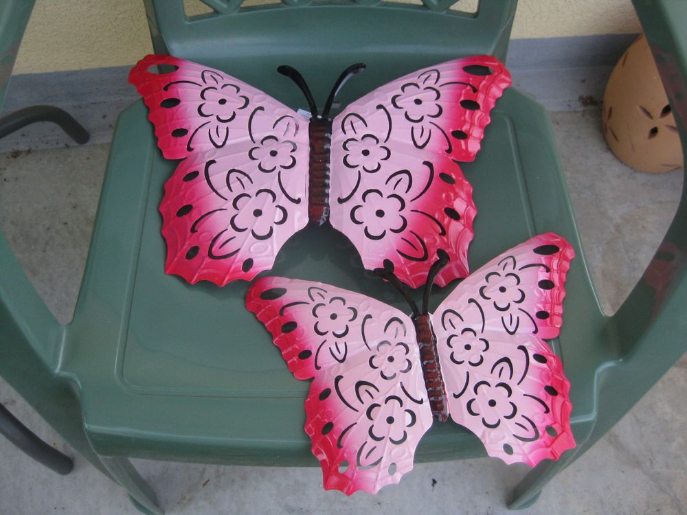 Hallo Deko-Liebhaber! 🦋 Suchst du eine charmante Deko für Garten, Terrasse oder Wohnzimmer? Diese süßen Metall-Schmetterlinge bringen Leben in deine vier Wände!\n\nDas Set kommt mit 4 bunten Schmetterlingen in den Farben Rot, Gelb, Grün und Blau. Jeder Schmetterling misst 12 x 18,5 cm - die perfekte Größe, um überall einen fröhlichen Akzent zu setzen.\n\nAus hochwertigem, rostfreiem Eisen gefertigt, sind diese Schmetterlinge richtig robust. Sie verblassen nicht in der Sonne, verformen sich nicht und sind absolut witterungsbeständig. Perfekt also für draußen, aber auch innen machen sie eine super Figur!\n\nAuf der Rückseite haben die Schmetterlinge praktische Haken. Einfach mit Hammer und Nagel anbringen und schon verzaubern sie deine Wände, Zäune oder Bäume. Die Montage dauert nur wenige Minuten.\n\nStell sie dir vor: Im Garten flattern sie zwischen den Blumen, an der Hauswand begrüßen sie deine Gäste oder im Wohnzimmer sorgen sie für frühlingshafte Stimmung. Die lebensechten Details und leuchtenden Farben ziehen sofort alle Blicke auf sich.\n\nSuper als Geschenk für Gartenfreunde, zur HausEinweihung oder einfach als kleine Aufmerksamkeit für dich selbst. Diese Schmetterlinge machen einfach immer eine gute Figur!\n\nAlso, hol dir diese fröhlichen Flattermänner und verleihe deinem Zuhause einen Hauch von Natur und Eleganz! Deine Wände werden es dir danken! 🌸