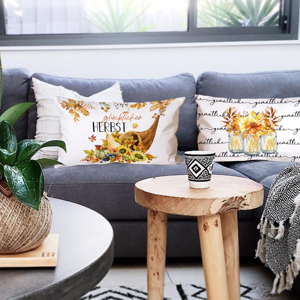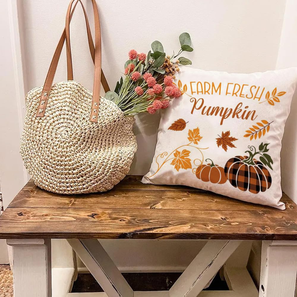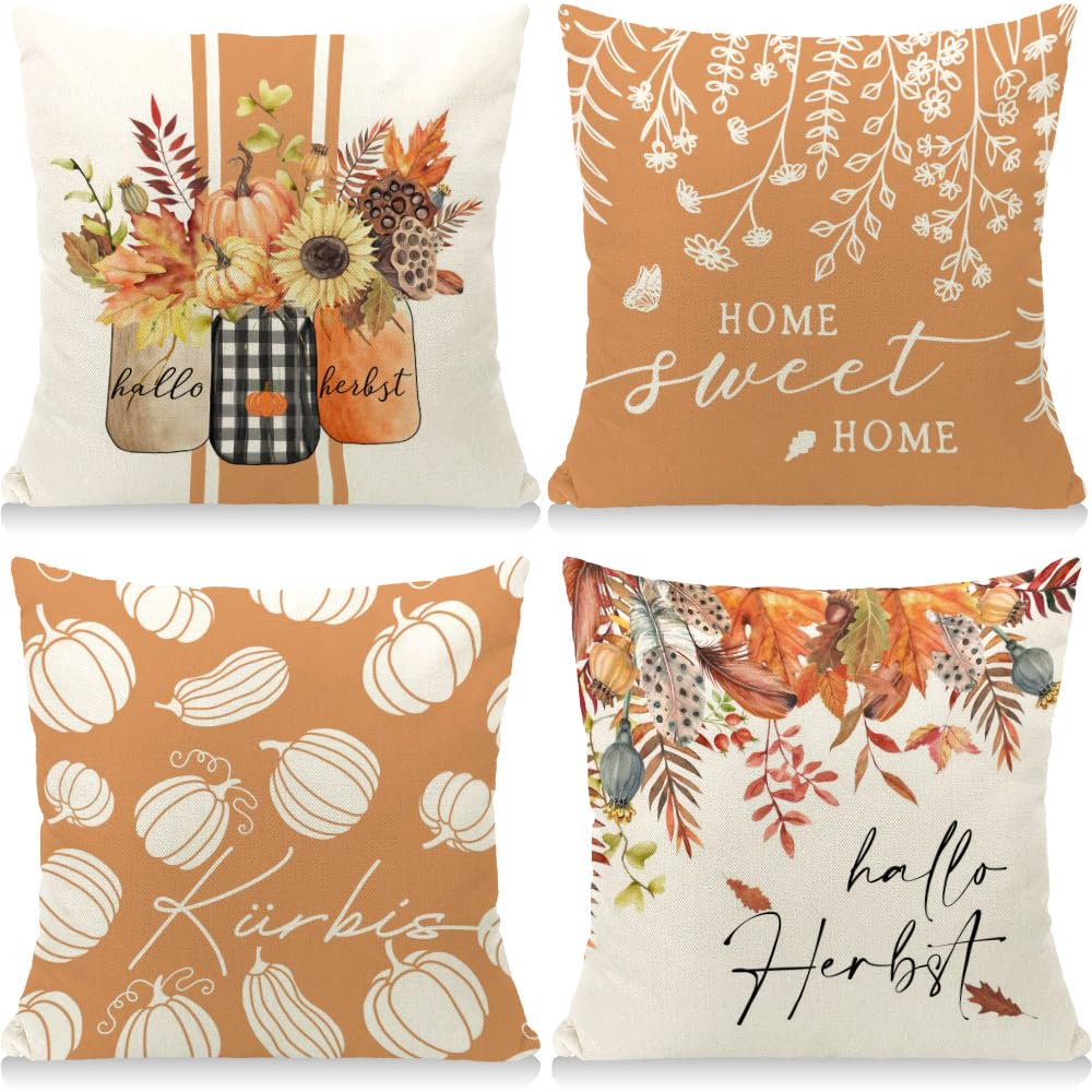Herbst-Fans, aufgepasst! Dieses 4er-Set Kissenbezüge mit süßem 'Hallo Kürbis'-Design bringt gemütliche Herbststimmung in dein Zuhause! Aus einer Mischung aus Baumwolle und Leinen sind die Bezüge nicht nur schön weich, sondern auch robust und langlebig. Mit unsichtbarem Reißverschluss sehen die Kissen super clean aus und sind einfach zu befüllen. Die hochwertige Digitaldruck-Technologie sorgt für lebendige Farben, die nicht so schnell verblassen. Perfekt für Sofa, Bett, Gartenmöbel oder als herbstliche Deko im Wohnzimmer! Einfach in der Maschine waschen (kalt) und schon sind sie wieder frisch. Mach es dir mit diesen kuscheligen Kissen gemütlich und genieße die gemütliche Jahreszeit in vollen Zügen! Nur die Bezüge - Kissenfüllungen sind nicht enthalten.