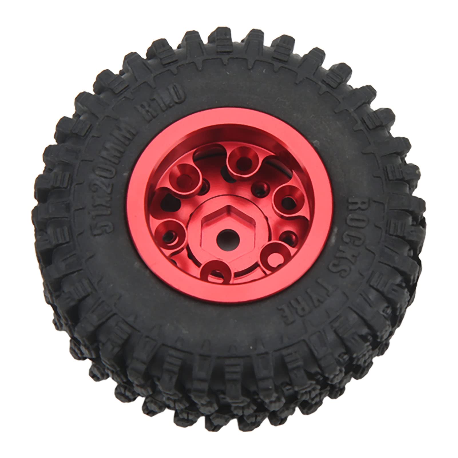 Hey RC-Fans! Diese SUNGOOYUE Reifen sind genau das Richtige für eure 1/24 Modellautos von AXIAL und SCX24. Mit den Maßen 50mm Durchmesser und 20mm Breite passen sie perfekt und sehen dabei richtig aggressiv aus. Das coole an den Reifen ist die tiefe Stollenstruktur - die gibt eurem RC-Auto mega viel Grip, egal ob auf Sand, Schotter oder im Gelände.\\n\\nDie Felgen sind aus Aluminiumlegierung gefertigt, das heißt sie sind super stabil und brechen nicht so schnell. Der Sechskant-Durchmesser beträgt 7,5mm, damit sitzen die Reifen bombenfest. Im Lieferumfang sind alles dabei: 4 Reifen, 2 Schraubenschlüssel und 48 Schrauben - also alles was man für den Einbau braucht.\\n\\nDie Montage ist total einfach, dank der Messingkupplung. Einfach draufstecken, festschrauben und schon kann dein RC-Auto durchs Gelände jagen. Die starke Dämpfung federt auch größere Stöße super ab und die hohe Abriebfestigkeit sorgt dafür, dass die Reifen lange halten.\\n\\nEgal ob du dein RC-Auto aufmotzen willst oder einfach nur neue Reifen brauchst - mit diesem Set machst du nichts falsch. Die rote Farbe sieht dazu noch richtig sportlich aus! Perfekt für alle, die ihr AXIAL oder SCX24 Modell mal so richtig fordern wollen.