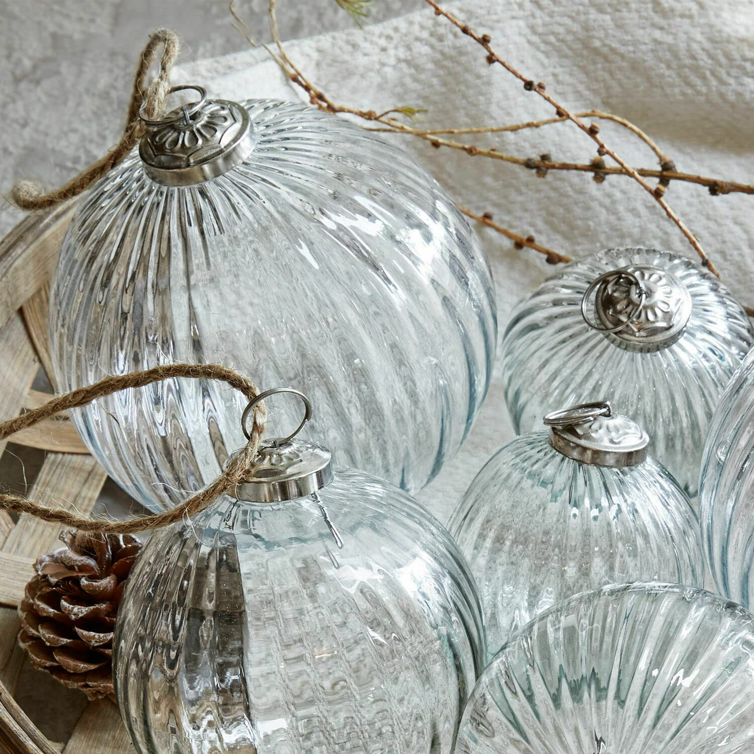 Zauberhafter Weihnachtsschmuck der ganz besonderen Art! Dieses 4er Set besteht aus mundgeblasenen Glas-Kugeln mit wunderschönen Blüten- und Zweig-Prägungen in silber. Drei große Kugeln (ca. 11cm) und eine kleine (ca. 9cm) sorgen für Abwechslung am Baum. Die Messing-Ösen machen das Gesamtbild komplett. Jedes Stück ist ein Unikat mit nostalgischem Charme. Perfekt um deinen Weihnachtsbaum zu schmücken oder als Tischdekoration. Achtung: Zerbrechlich! Nicht für Kinder geeignet. Ein zeitloser Schmuck, der Jahr für Jahr für festliche Stimmung sorgt. Weihnachten kann kommen!
