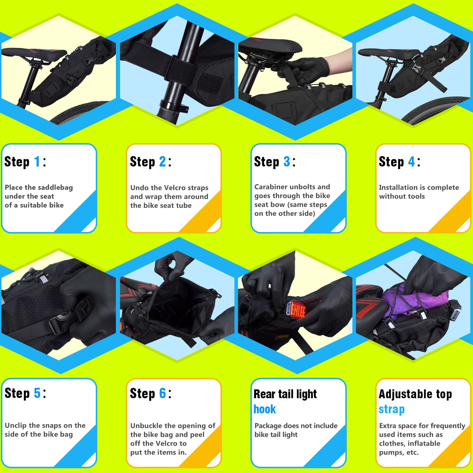Hier findest du Platz für dein Fahrradwerkzeug, Ersatzschläuche, Snacks, Powerbank, Regenjacke und deine Schlüssel. Alles sicher verstaut und griffbereit! Die Tasche wird blitzschnell mit Klettverschluss und Schnalle am Sattel befestigt – ganz ohne Werkzeug.