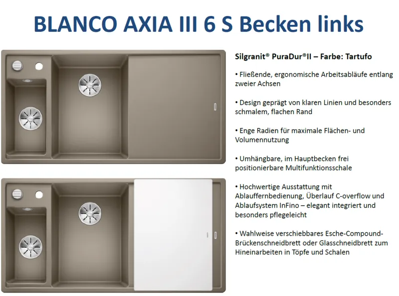 Wow, diese BLANCO AXIA III Spüle ist einfach der Hammer! Aus robustem SILGRANIT in schwarz gefertigt, sieht sie nicht nur mega stylisch aus, sondern ist auch super praktisch. Die Einbauart von oben macht die Montage zum Kinderspiel und sie ist reversibel - also perfekt für Links- und Rechtshänder. Das mitgelieferte Glasschneidbrett ist ein absolutes Highlight! Du kannst es einfach verschieben und direkt in Töpfe und Schüsseln reinarbeiten. Mit dem großen Hauptbecken hast du genug Platz auch für sperrige Töpfe und Pfannen. Das ergonomische AXen-Konzept sorgt für fließende Arbeitsabläufe in der Küche. Und das InFino-Ablaufsystem sieht nicht nur gut aus, sondern gibt auch Geschirr einen sicheren Stand. Wichtig: Denk dran, du brauchst noch einen BLANCO Geruchsverschluss und Silikon für die Montage. Die Hahnlochbohrungen sind schon vorgefräst - einfach mit Hammer und Dorn durchschlagen. Perfekt für 50 cm breite Unterschränke und ein echter Hingucker in jeder Küche!