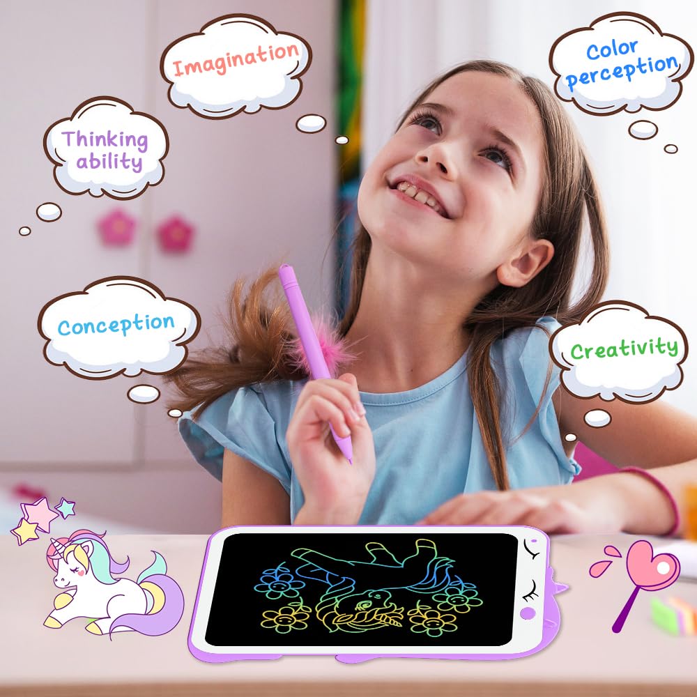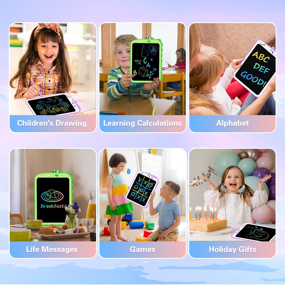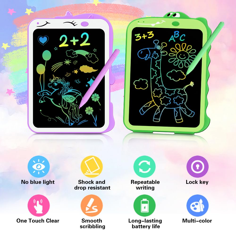 Malen ohne Chaos - diese 2 LCD Schreibtafeln sind perfekt für kreative Kinder! Mit süßen Einhorn und Dinosaurier Motiven machen sie gleich doppelt Spaß. Der 8,5 Zoll große Bildschirm ist augenschonend und völlig unbedenklich - keine Strahlung, keine Tinte, kein Staub! Einfach mit dem Stift malen und mit einem Knopf alles wieder löschen. Super praktisch für unterwegs: Auto, Restaurant, Flugzeug - überall können die Kids malen ohne Papiermüll. Mit 100.000 Schreibzyklen hält die Tafel ewig (nur Batterie wechseln). Die Stifte sind fest angebunden, gehen also nicht verloren. Perfektes Geschenk für Kinder von 3-7 Jahren - pädagogisch wertvoll und macht riesig Spaß!