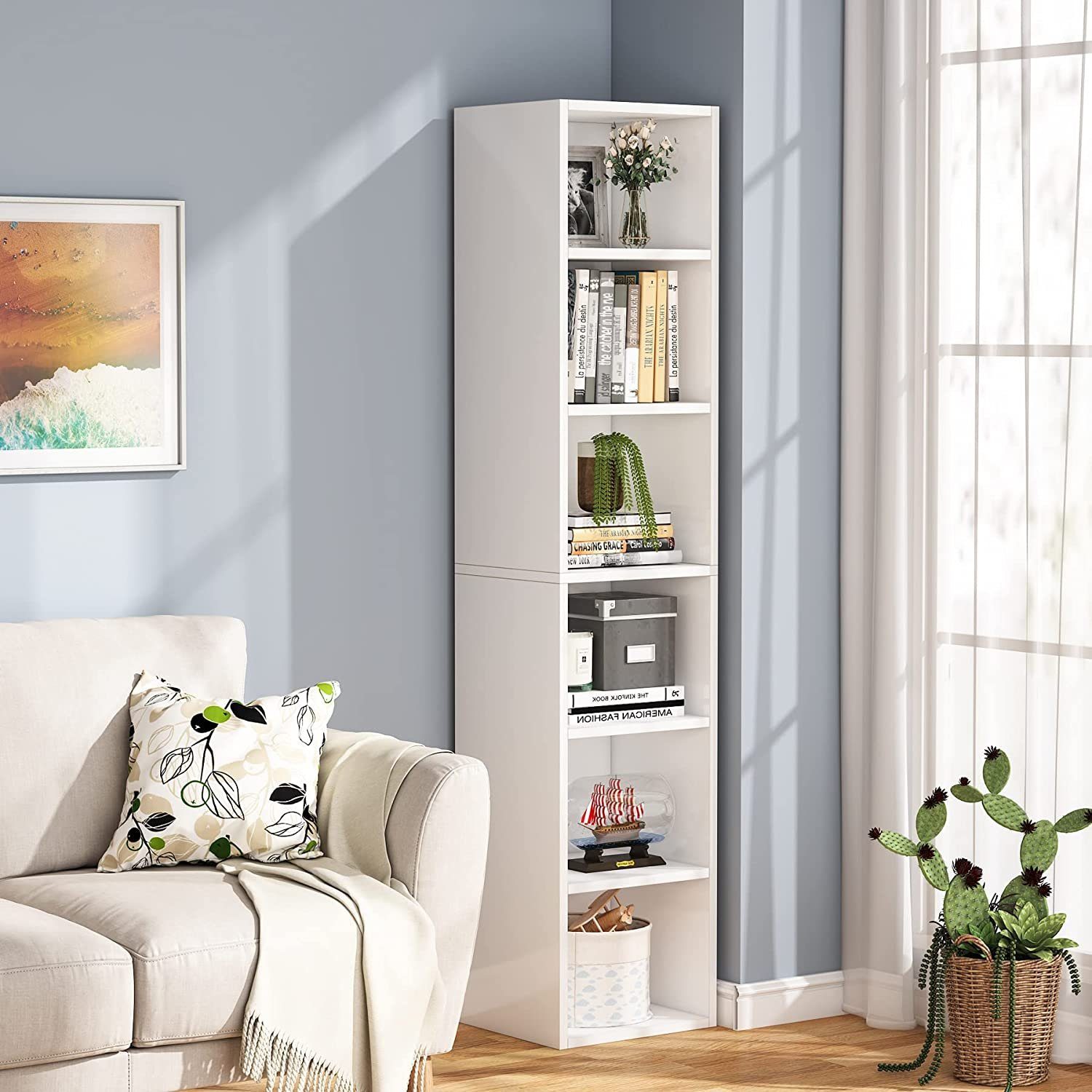 Mega praktisches Bücherregal von YUYUZI! 180cm hoch, aber nur 24cm tief - passt auch in schmale Ecken. Mit 5 Etagen hast du jede Menge Stauraum für Bücher, Deko, Pflanzen oder Sammelstücke. Aus robuster Dichteplatte, trägt bis zu 30kg. Maße: 80x24x180cm. In modernem Design mit glatten Kanten - keine scharfen Ecken. Vorgebohrte Löcher machen den Aufbau einfach. Passt super ins Wohnzimmer, Büro oder sogar Café. In Eiche-Optik, Warmweiß oder Feld-Eiche erhältlich. Wird flach geliefert, Montage nötig - aber mit Anleitung kein Problem. Mach deine vier Wände sofort ordentlicher und stylischer. Perfekt für alle, die platzsparend Ordnung schaffen wollen!