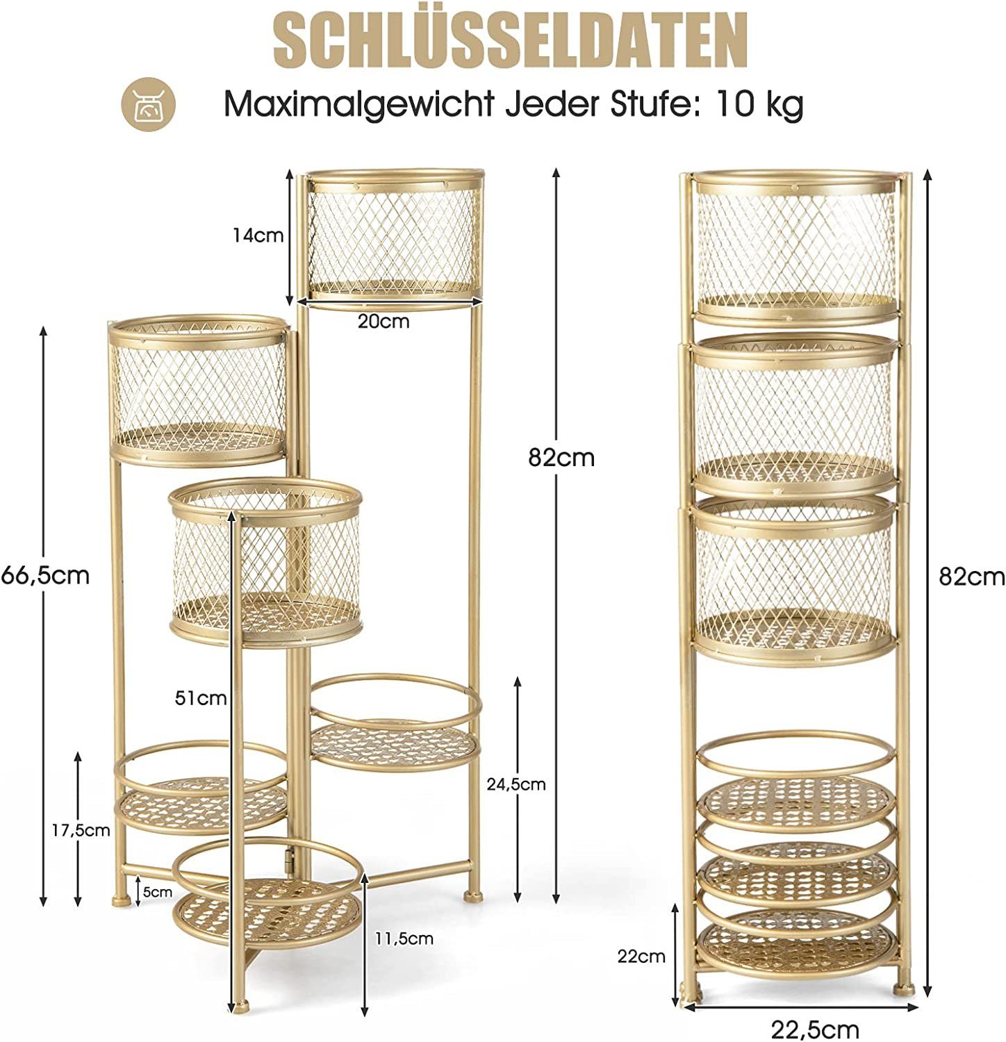 Wow, dieser Pflanzenständer ist echt praktisch! Mit 5 Etagen bietet er unheimlich viel Platz für all deine Pflanzen - ob auf dem Balkon, im Garten oder im Wohnzimmer. Das coole: Jede Ebene ist 66 cm breit und die Gesamthöhe beträgt 162,6 cm. So kriegen alle deine Pflanzen genug Sonnenlicht ab! Aus robustem Metall gefertigt und mit höhenverstellbaren Füßen, steht das Ding bombenfest. Und wasserdicht ist er auch noch - perfekt für draußen! Du kannst ihn aber nicht nur für Pflanzen nutzen, sondern auch für Bücher, Schuhe oder Deko. Der Aufbau ist total einfach - laut Anleitung machst du das fix alleine hin. Falls doch mal was nicht klappt, hilft der Kundenservice weiter. Egal ob du einen grünen Daumen hast oder einfach nur mehr Stauraum brauchst - dieser Ständer ist ein echter Allrounder!