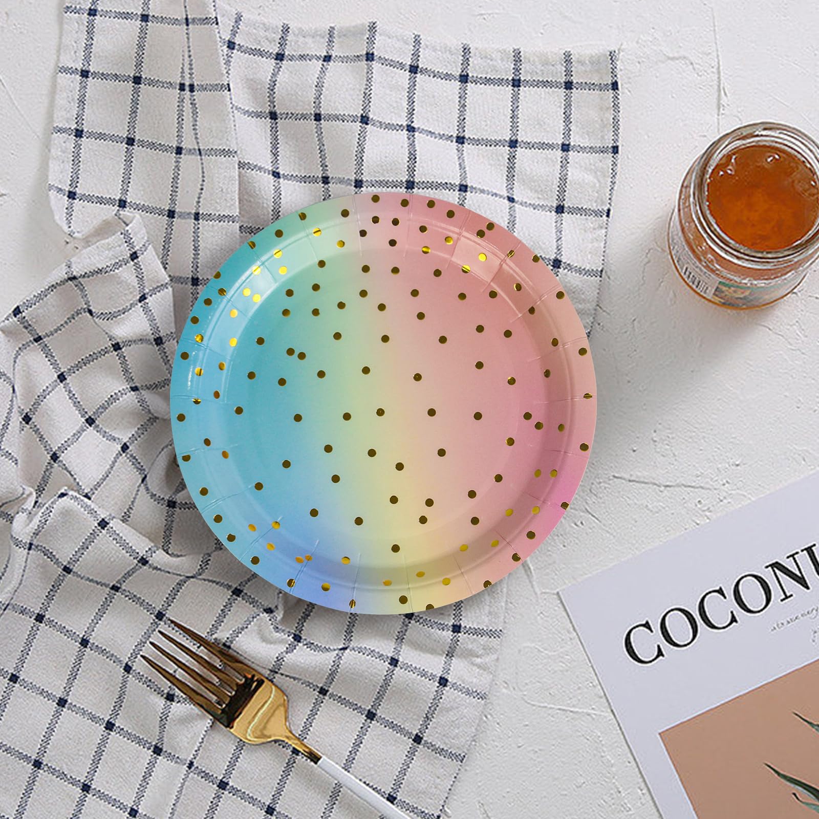 Party-Fans, diese Regenbogen Pappteller bringen Farbe auf jede Feier! 50 Stück in knalligen Regenbogenfarben mit goldigen Polka-Dots - das sieht einfach mega stylisch aus! Mit 17,8cm Durchmesser haben sie die perfekte Größe für alle möglichen Leckereien. Aus lebensmittelechtem Papier und komplett BPA-frei, also absolut unbedenklich. Das Beste: Die Teller sind super stabil - kein Durchweichen oder Brechen, selbst bei feuchten Speisen! Nach der Party einfach wegwerfen, denn sie sind biologisch abbaubar. So sparst du dir lästiges Spülen und hast mehr Zeit für deine Gäste. Perfekt für Geburtstage, Hochzeiten, Jubiläen, Picknicks oder Grillfeste. Die edle Optik mit Goldakzenten macht selbst einfache Buffets zu einem Hingucker. Ob Kindergeburtstag oder elegante Dinner-Party - mit diesen Tellern machst du immer eine gute Figur. Einfach praktisch, umweltfreundlich und dazu noch richtig hübsch!