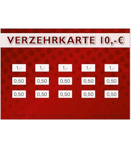 Perfekt für Gastronomie, Kantinen oder Vereinsfeste: Diese Verzehrkarten im 10€-Wert machen die Abrechnung super einfach! 5 Blöcke mit je 50 Karten - also insgesamt 250 Stück. Jede Karte ist fortlaufend nummeriert und hat ein Stempelfeld zur Fälschungssicherung. Format: 120x60mm auf stabilem 160g/m² Papier in grün. Einfach den entsprechenden Betrag abstreichen und schon ist die Marke gültig. Gesamtwert pro Block: 500€, für alle 5 Blöcke satte 2.500€! Seitlich geleimt mit Kartonrückwand für stabilen Halt. Mach deine Abrechnung professionell und unkompliziert. Ob für Mitarbeiterverpflegung oder Veranstaltungen - damit behältst du immer den Überblick!