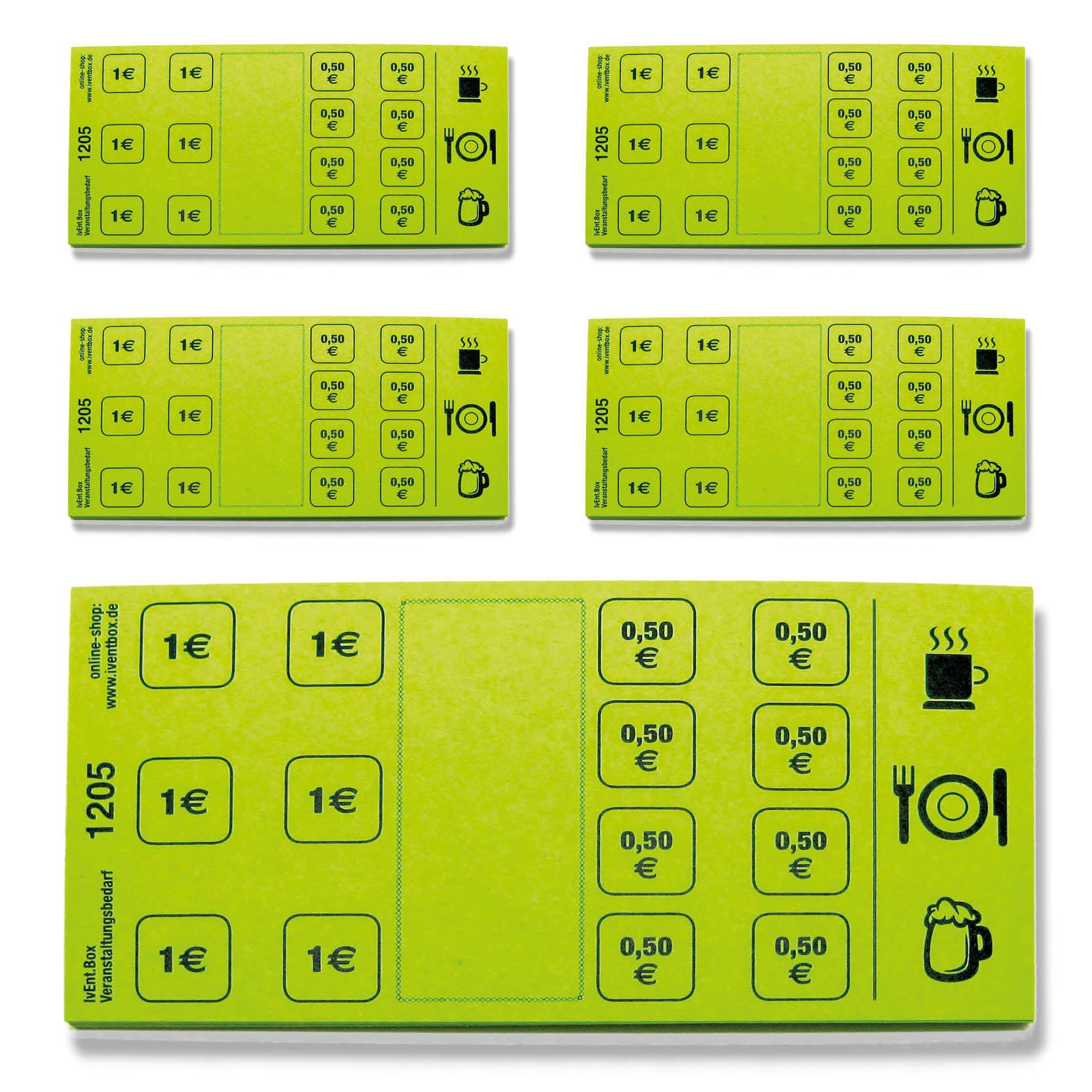 • 250 Verzehrkarten 10€ Wert - 5 Blöcke à 50 Blatt Grüne Abstreich-Wertmarken