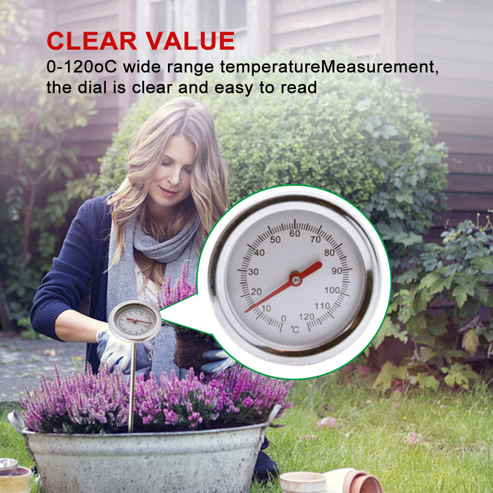 Für alle Gartenfreunde und Kompost-Experten! Dieses Bodenthermometer ist dein neuer bester Helfer im Garten! Mit einer extra langen 500 mm Edelstahlsonde kommst du tief in deinen Komposthaufen oder Boden und misst die Temperatur genau dort, wo sie wichtig ist. Aus robustem 304 Edelstahl gefertigt, ist dieses Thermometer stabil und langlebig - es hält auch bei regelmäßigem Einsatz locker stand! Das Beste daran: Es benötigt keine Batterie! Die Temperatur wird physikalisch erfasst - so hast du immer ein funktionierendes Werkzeug zur Hand, wenn du es brauchst. Die große Skala mit farbkodierter Temperaturführung macht das Ablesen super einfach. Du siehst auf einen Blick, ob dein Kompost die optimale Temperatur hat oder ob du nachsteuern musst! Der Temperaturbereich von 4,4 °C bis 82,2 °C deckt alles ab, was du im Garten brauchst. Ob du die Temperatur deines Komposts, deiner Gartenerde, von Dünger oder sogar von Wasser messen willst - dieses Thermometer ist vielseitig einsetzbar! Mit einem Zifferblatt-Durchmesser von 54 mm und einer Sondengröße von 5 x 500 mm ist es genau das Richtige für den ernsthaften Gärtner. Im Lieferumfang ist 1 x Bodenthermometer enthalten - alles was du brauchst, um sofort loszulegen! Also hol dir dieses praktische Gartenthermometer und optimiere deinen Kompostierungsprozess - deine Pflanzen werden es dir danken!