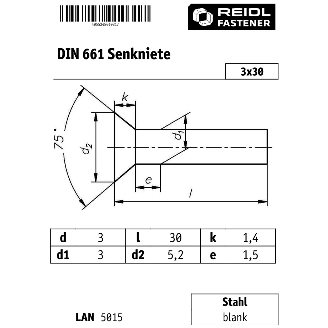 500 Stück Senknieten DIN 661 Stahl Blank - 5x18 Mm Für Professionelle Montage