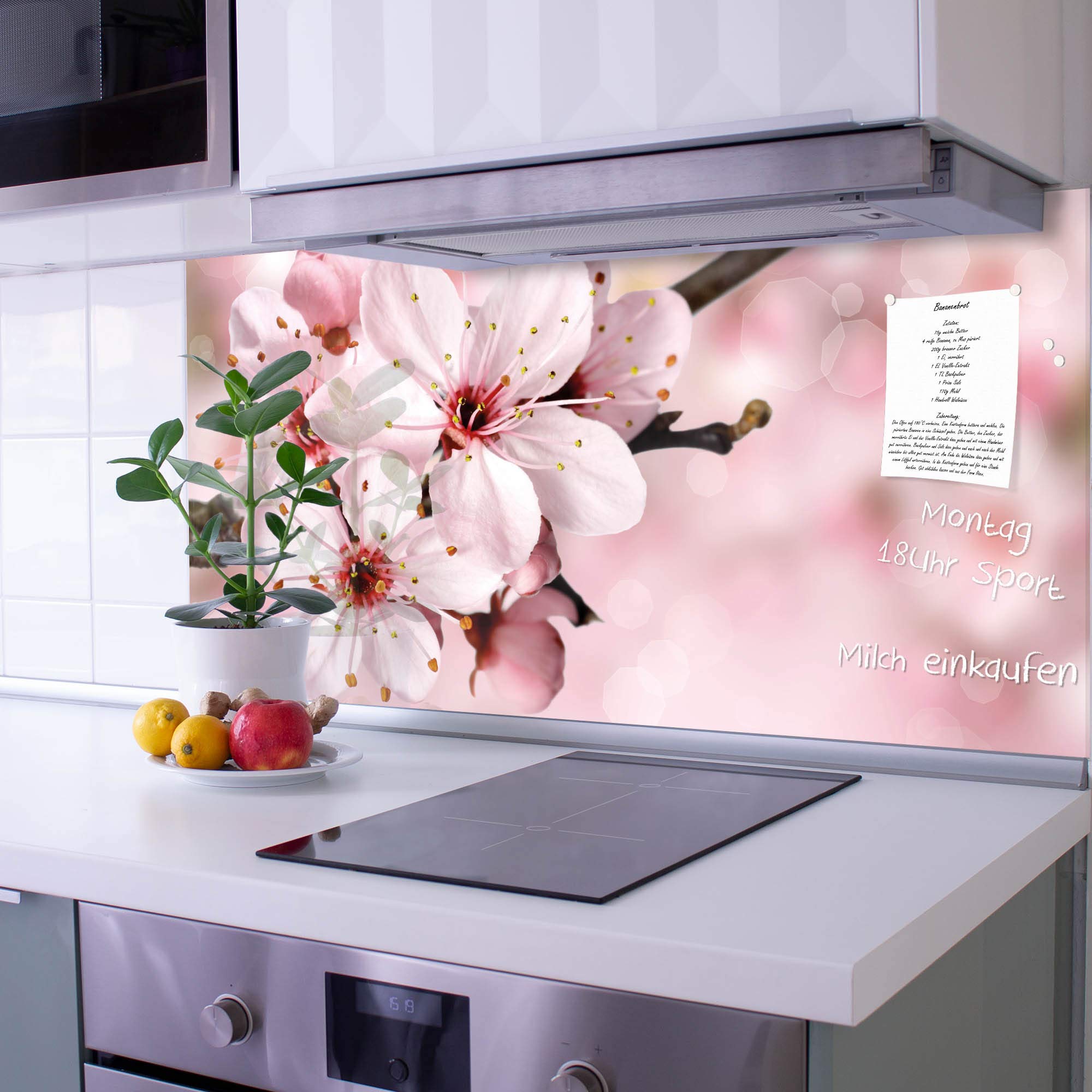 Wow, diese Glasrückwand macht deine Küche zum echten Hingucker! Mit dem zarten Kirschblüten-Motiv bringst du Frühlingsstimmung in dein Zuhause. Und das Beste: Du musst nicht mal bohren! Die 50x50cm große Platte aus 4mm Sicherheitsglas klebst du einfach an die Wand - fertig. Perfekter Schutz vor Fettspritzern am Herd und Wasserflecken am Waschbecken. Noch mehr Vorteile: Die Oberfläche ist magnetisch, du kannst also Notizen und Fotos ankleben. Außerdem beschreibbar mit Kreidestiften - super für Einkaufslisten oder Kochideen. Die abgerundeten Kanten sehen nicht nur gut aus, sondern sind auch sicher. Hergestellt in Sachsen mit Liebe zum Detail, keine Billig-Importware. Mach deine Küche individuell und praktisch zugleich! Einfach anbringen und jahrelang Freude daran haben. Perfekt für Mieter und alle, die keine Lust auf Bohren haben.