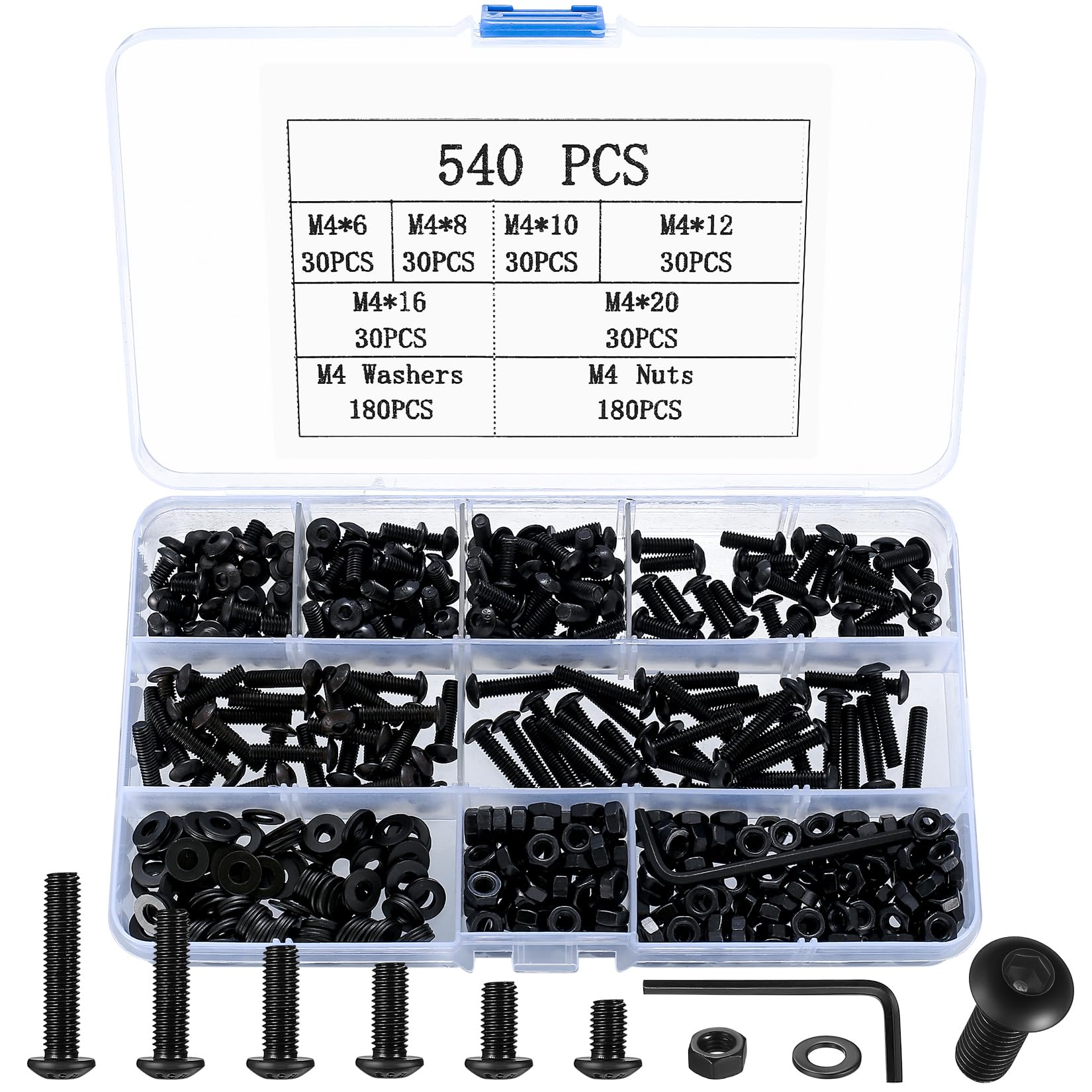 Endlich Ordnung im Werkzeugkasten! Dieses mega-praktische M4 Schrauben Set mit 540 Teilen hat alles, was du brauchst. Enthalten sind Schrauben in 6 verschiedenen Längen (6, 8, 10, 12, 16, 20mm), plus 180 Muttern und 180 Unterlegscheiben - alles in M4 Größe. Aus hochwertigem Kohlenstoffstahl, extrem fest und langlebig. Die Halbrundkopf-Innensechskant-Schrauben halten großen Belastungen stand und die Gewinde sind präzise geschnitten. Perfekt für RC-Modelle, Fahrräder, Möbel, Elektronik und unzählige andere Projekte. Kommt in einer stabilen Aufbewahrungsbox mit praktischem Schraubenschlüssel - so findest du immer schnell die richtige Größe. Schwarz beschichtet für zusätzlichen Korrosionsschutz. Ein Must-Have für jeden Heimwerker!