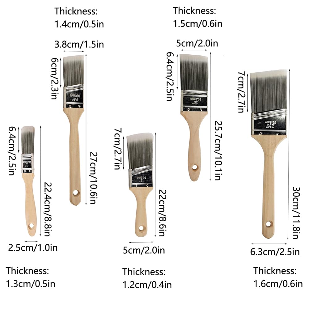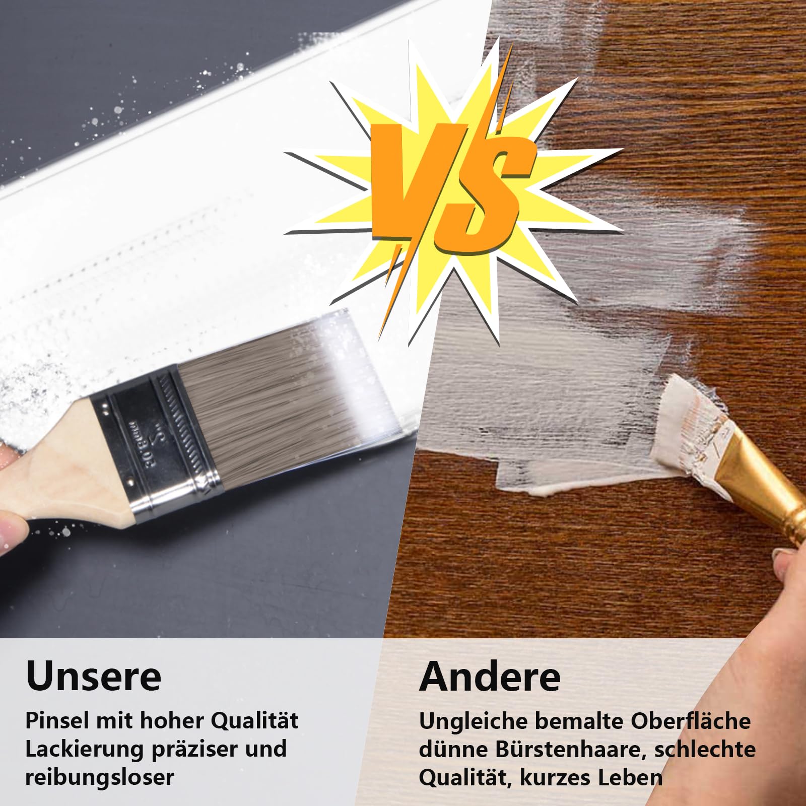 Perfektes Pinsel-Set für deine nächsten Malerarbeiten! Enthält 2 Flachpinsel (25mm und 50mm) und 3 praktische Winkelbürsten (38mm, 50mm, 63mm) - alles was du brauchst für professionelle Ergebnisse. Die Nylon-Borsten sind super dicht und glatt, verteilen die Farbe gleichmäßig ohne lästige Pinselstriche. Der rutschfeste Holzgriff liegt gut in der Hand und verhindert lästige Handkrämpfe auch bei längeren Arbeiten. Ideal für Lacke, Lasuren, Wandfarben - ob an Türen, Zäunen, Möbeln oder für Kunstprojekte. Einfach nach Gebrauch mit Verdünner reinigen und wiederverwenden. Dieses Set ist dein zuverlässiger Begleiter für alle Heimwerker-Projekte drinnen und draußen. Macht das Streichen zum Kinderspiel und sorgt für ein perfektes Finish!