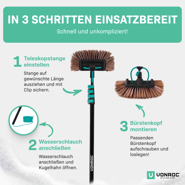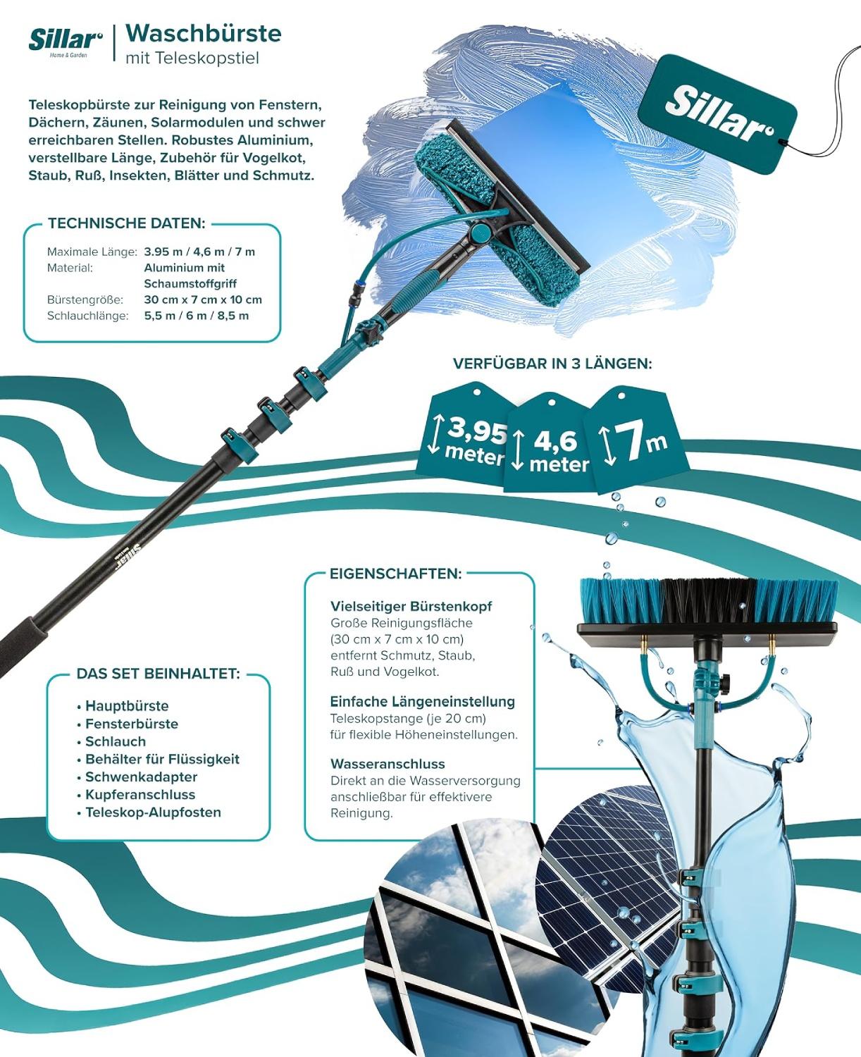 Putzmuffel, diese Teleskop-Bürste macht Reinigen tatsächlich einfach! Mit stolzen 5 Metern Länge erreichst du damit ganz easy Solaranlagen, Glasdächer, Fenster im Obergeschoss oder Fassaden. Einfach an den Gartenschlauch anschließen - der Universalanschluss passt an fast jeden Schlauch. Der Clou: Integrierter Seifenspender! Einfach Seife einfüllen, Knopf drücken und schon schäumt es nur so. Der winkelverstellbare Kopf kommt auch in die blödesten Ecken. Superleichtes Aluminium - auch bei langem Putzen wird der Arm nicht müde. Und wenn du fertig bist, einfach auf ca. 1 Meter zusammenschieben - platzsparend verstauen ist kein Problem. Die Borsten sind robust und kratzen nicht. Ob nach dem Winter die Solaranlage putzen oder das Terrassendach vom Schmuck befreien - mit diesem Teil geht's easy. Einfach ausfahren, Wasser an und losputzen!