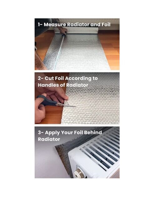 Heizkosten zu hoch? Diese Heizkörperfolie ist die geniale Lösung! Mit 5m Länge und 60cm Breite hast du genug Material für mehrere Heizkörper. Die 3mm dicke Folie reflektiert 95% der Wärme zurück in den Raum – statt dass die Wand hinter dem Heizkörper warm wird. Einfach mit Schere oder Messer zuschneiden, hinter den Heizkörper kleben und schon sparst du Energie und Geld! Die Folie verschwindet komplett unsichtbar hinter dem Heizkörper – stört das Design deiner Wohnung überhaupt nicht. Im Winter bleibt's wärmer, im Sommer kühler – und deine Heizkostenrechnung wird deutlich freundlicher. Reduziert nebenbei deinen CO2-Fußabdruck. Einfach messen, zuschneiden, anbringen – und dich über die Ersparnis freuen! Für 3 oder mehr Heizkörper reicht's locker.