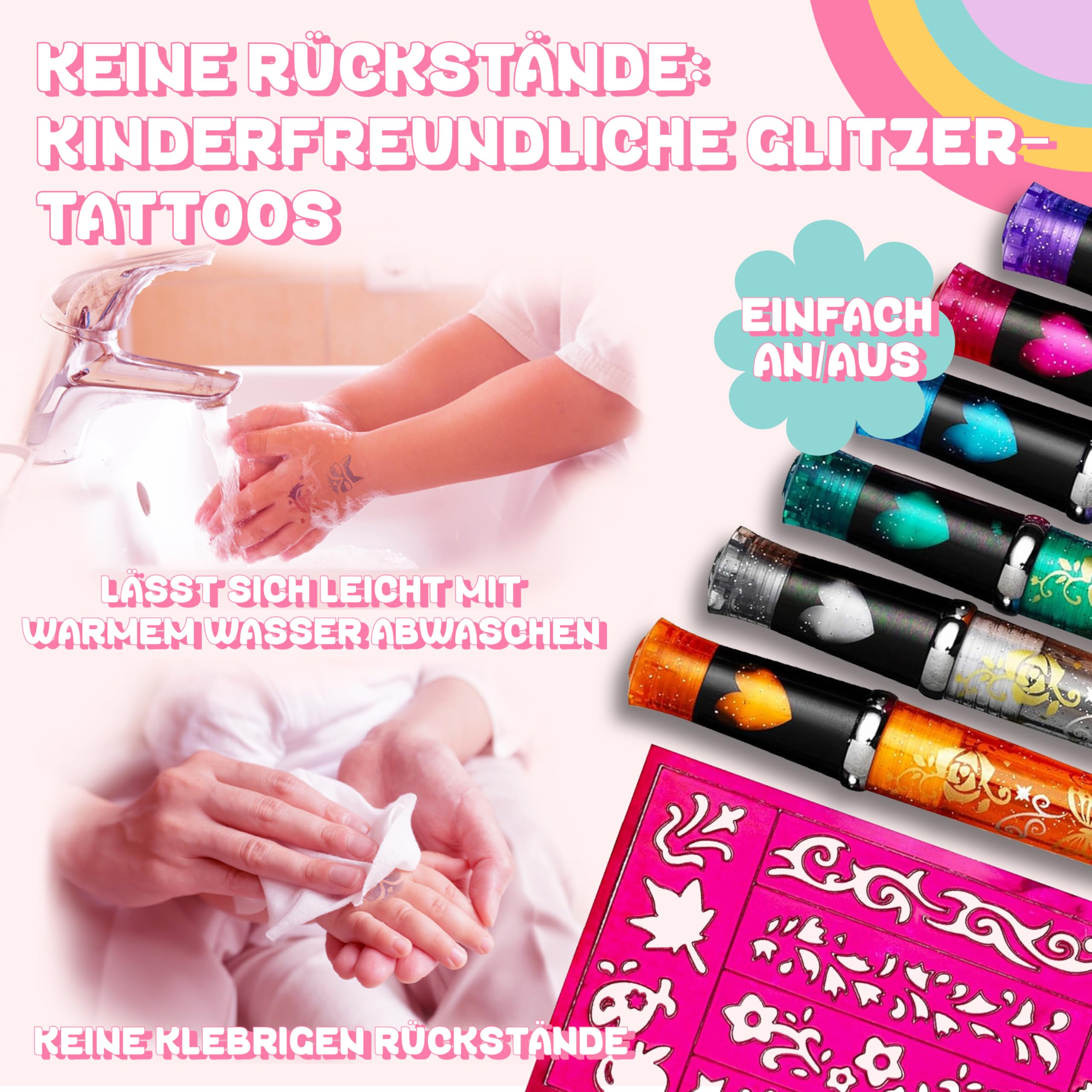 Coole Tattoos ganz ohne Schmerzen! Dieses umfangreiche Tattoo-Set von Clundoo bringt riesigen Spaß für Kinder. Enthalten sind 6 bunte Glitzerstifte in Silber, Lila, Blau, Grün, Orange und Rosenrot, plus 9 coole Schablonen mit 80 verschiedenen Motiven. Einfach die Schablone auf die Haut kleben, mit den Stiften ausmalen und schon entstehen tolle temporäre Tattoos. Vollkommen unbedenklich für die Haut und mit Wasser und Seife einfach wieder entfernbar. Perfekt für Kindergeburtstage, Halloween, Karneval oder einfach nur für einen lustigen Nachmittag. Die Stifte sind hautfreundlich und verursachen keine allergischen Reaktionen. Ein super Geschenk für alle kreativen Kinder ab 3 Jahren! Aber Achtung: Nicht auf verletzter Haut verwenden.