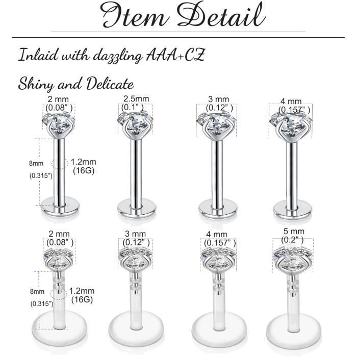 Verpasse deinem Style den letzten Schliff mit diesem wunderschönen Helix Piercing Set! Das 6-teilige Set besteht aus hochwertigem Edelstahl mit funkelnden Zirkonia-Steinen in verschiedenen Größen (3mm und 5mm). Mit 20G Stärke (0,8mm) und 6mm Stablänge perfekt für Helix, Tragus, Nasen- oder Lippenpiercings. Die gewindelose Konstruktion macht das An- und Abschrauben zum Kinderspiel. Jedes Piercing wird poliert bis es glänzt und kommt in einem samtigen Geschenkbeutel - ideal auch als Mitbringsel! Ob für dich selbst oder als Geschenk für Piercing-Fans - dieses Set begeistert mit seiner Vielfalt und Qualität. Wechsle je nach Anlass und Laune deinen Look! Achte vor dem Kauf auf die richtige Größe für dein bestehendes Piercing.