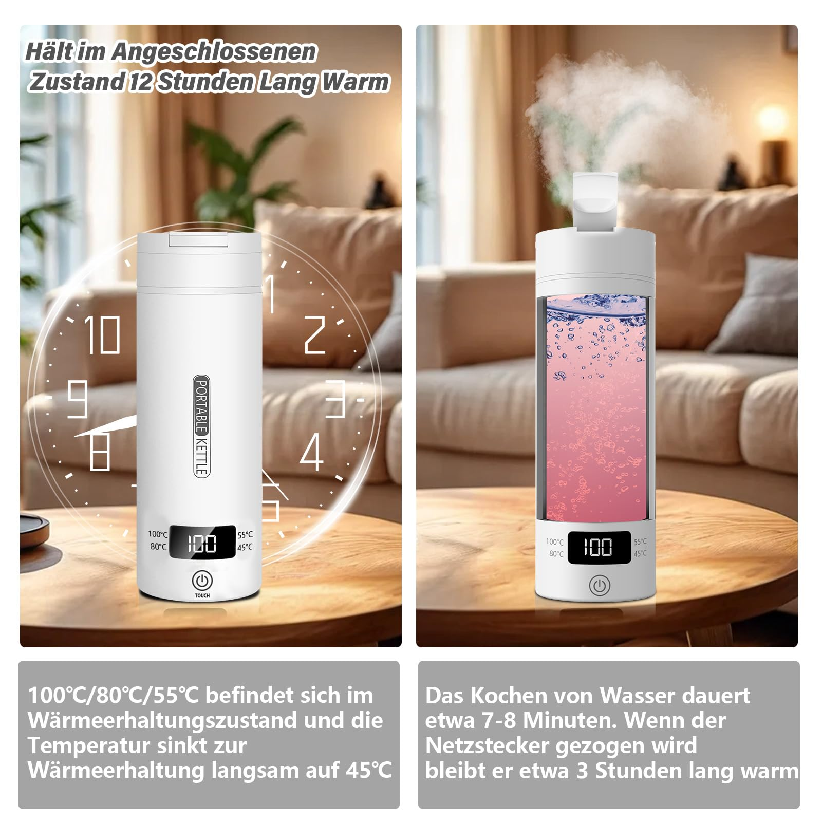 Mensch, dieser Reise-Wasserkocher ist ja total praktisch für unterwegs! Mit 500 ml Fassungsvermögen ist er groß genug für mehrere Tassen, aber mit nur 80 mm Durchmesser und 228 mm Höhe trotzdem super kompakt. Das beste: Du hast 6 Temperaturstufen von 45°C bis 100°C - perfekt für Tee, Kaffee, Milch oder einfach nur heißes Wasser! Die digitale Anzeige zeigt dir immer genau an, welche Temperatur gerade eingestellt ist. Hergestellt aus 316er Edelstahl ist der Kocher nicht nur langlebig, sondern auch super einfach zu reinigen. Der versteckte Griff macht das Tragen easy, und die rutschfeste Unterseite sorgt für sicheren Stand. Besonders clever: Du kannst direkt aus dem Kocher trinken, ohne den Deckel öffnen zu müssen! Perfekt für Reisen, Camping, Büro oder Hotel - einfach an ne 220V Steckdose anschließen und in wenigen Minuten hast du heißes Wasser. Die Warmhaltefunktion sorgt dafür, dass dein Getränk nicht so schnell abkühlt. Also, wenn du auch unterwegs nicht auf deine Lieblingsgetränke verzichten willst, ist dieser Reise-Wasserkocher genau das Richtige! Einfach einpacken und immer heißes Wasser dabei haben - mehr Komfort geht kaum!