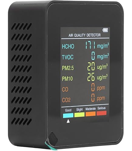 Behalte deine Raumluft immer im Blick! Dieses vielseitige 6-in-1 Messgerät überwacht gleichzeitig CO2-Gehalt, Formaldehyd (HCHO), TVOC, PM2.5/PM10 Feinstaub, Temperatur und Luftfeuchtigkeit. Das klare 2,8-Zoll Farbdisplay zeigt alle Werte übersichtlich an, inklusive Trendgrafiken für bessere Analyse. Das intelligente 4-Farben-Warnsystem (Grün/Gelb/Orange/Rot) visualisiert die Luftqualität auf einen Blick - bei Grenzwertüberschreitung ertönt zusätzlich ein Sprachalarm. Das innovative Belüftungsdesign mit mehrseitigen Luftkanälen sorgt für 20% präzisere Messungen als bei herkömmlichen Geräten. Mit dem 1200mAh Akku und Type-C-Anschluss hast du bis zu 10 Stunden mobile Nutzung - aufladbar per Powerbank, PC oder Autoladegerät. Perfekt für Zuhause, Büro, Schule oder unterwegs. Besonders wichtig für Allergiker, Familien mit Kindern oder in stark belasteten Innenräumen. Einfache Bedienung, sofort einsatzbereit. Schütze deine Gesundheit mit präziser Luftüberwachung!