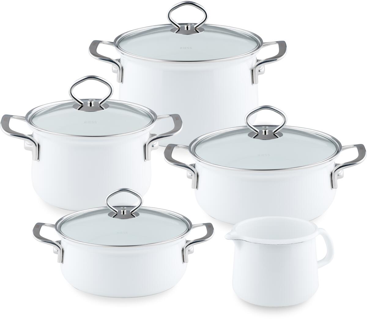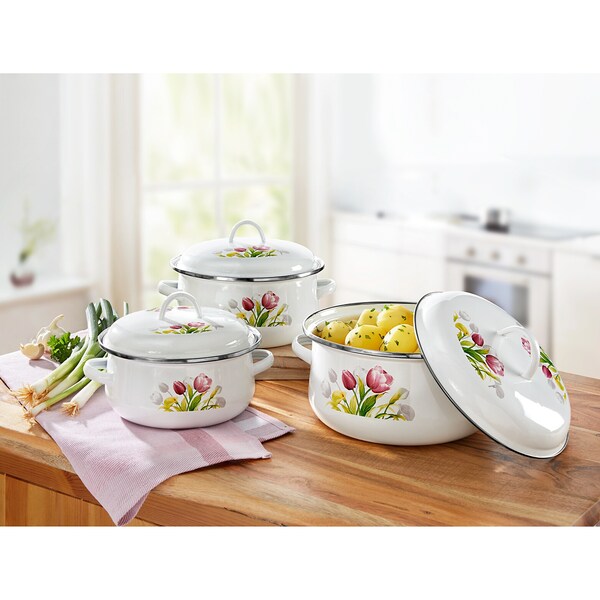 Dieses Sonnenblumen-Topfset bringt einfach gute Laune in deine Küche! Die fröhlichen Emaille-Töpfe sehen nicht nur super aus, sondern sind auch mega praktisch. Mit drei Größen - 950 ml, 1.400 ml und 2.000 ml - hast du für jede Mahlzeit den passenden Topf parat. Vom kleinen Snack bis zur Familiensuppe ist alles dabei. Und das Beste: Sie stapeln sich platzsparend ineinander - perfekt für kleine Küchen! Ob Induktion, Ceran oder Gasherd - die Töpfe funktionieren auf allem. Nach dem Kochen einfach in die Spülmaschine und fertig. Die Deckel passen perfekt und halten die Wärme super. Emaille ist übrigens total pflegeleicht und lebensmittelecht. Macht sich auch super als Geschenk für Einzug, Geburtstag oder einfach so. Mit dem sonnigen Sonnenblumen-Design kocht es sich gleich doppelt so gut - versprochen!